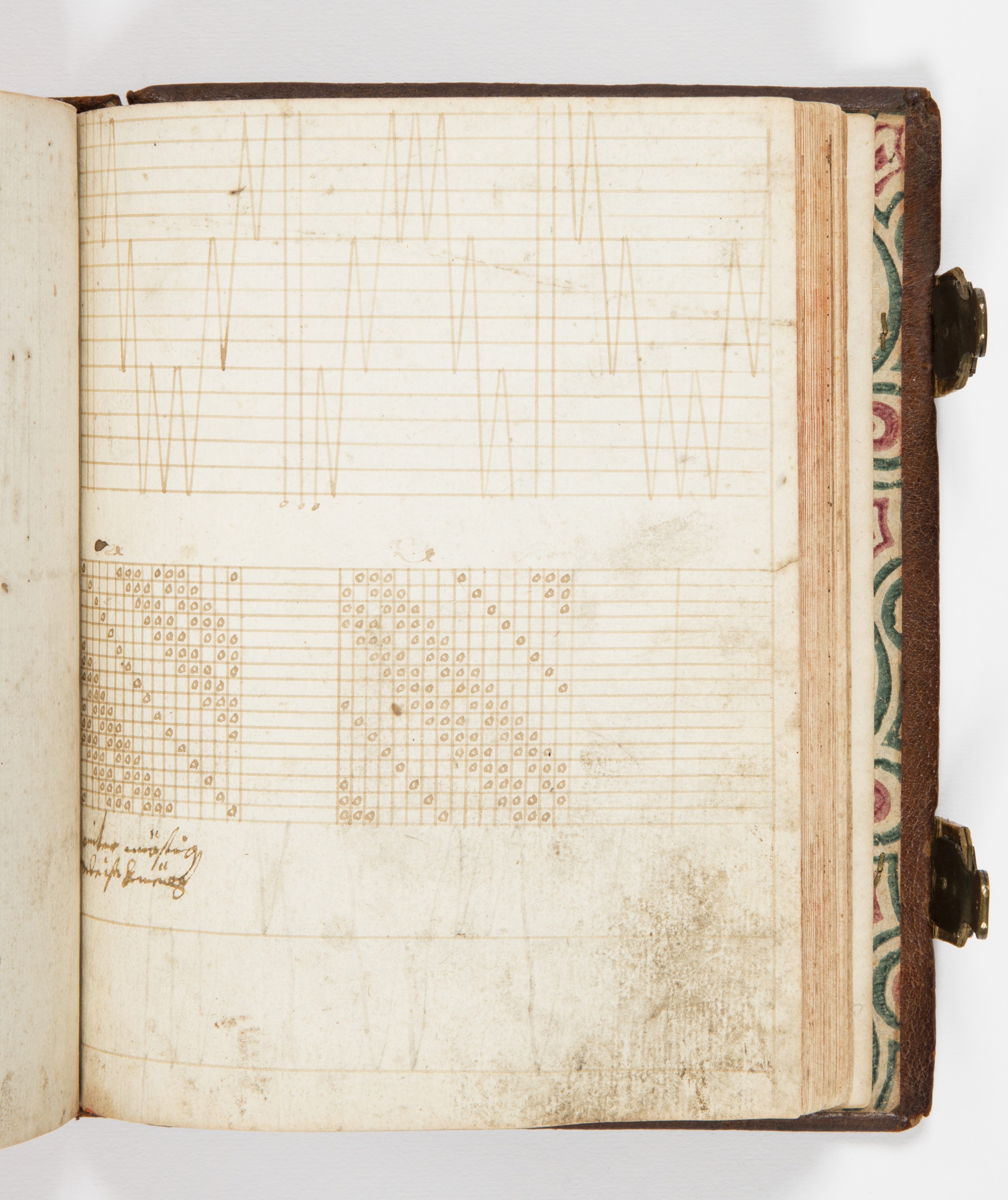 This is a Pattern book. It is dated 1760 and we acquired it in 1961. Its medium is leather, paper, metal. It is a part of the Textiles department.