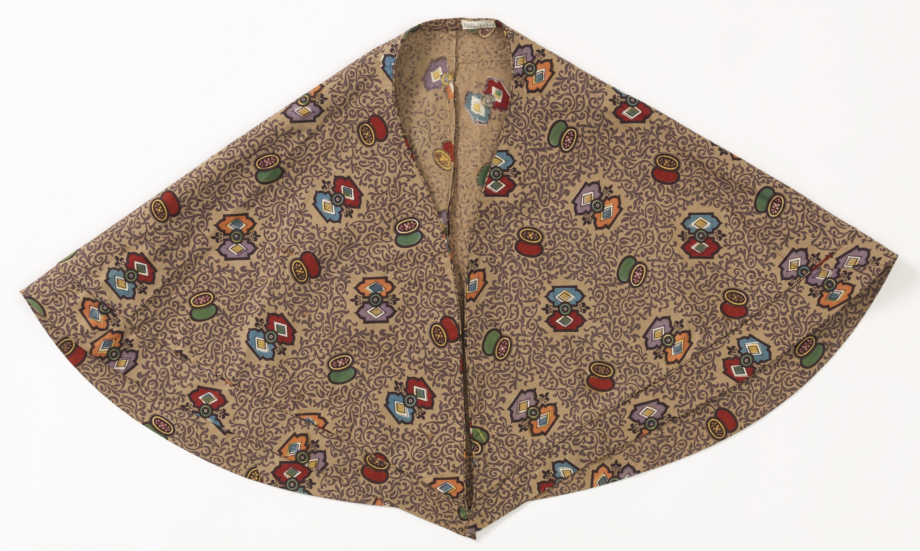 This is a Capelet. It is dated ca. 1825 and we acquired it in 1961. Its medium is cotton and its technique is printed by block and engraved roller on plain weave. It is a part of the Textiles department.