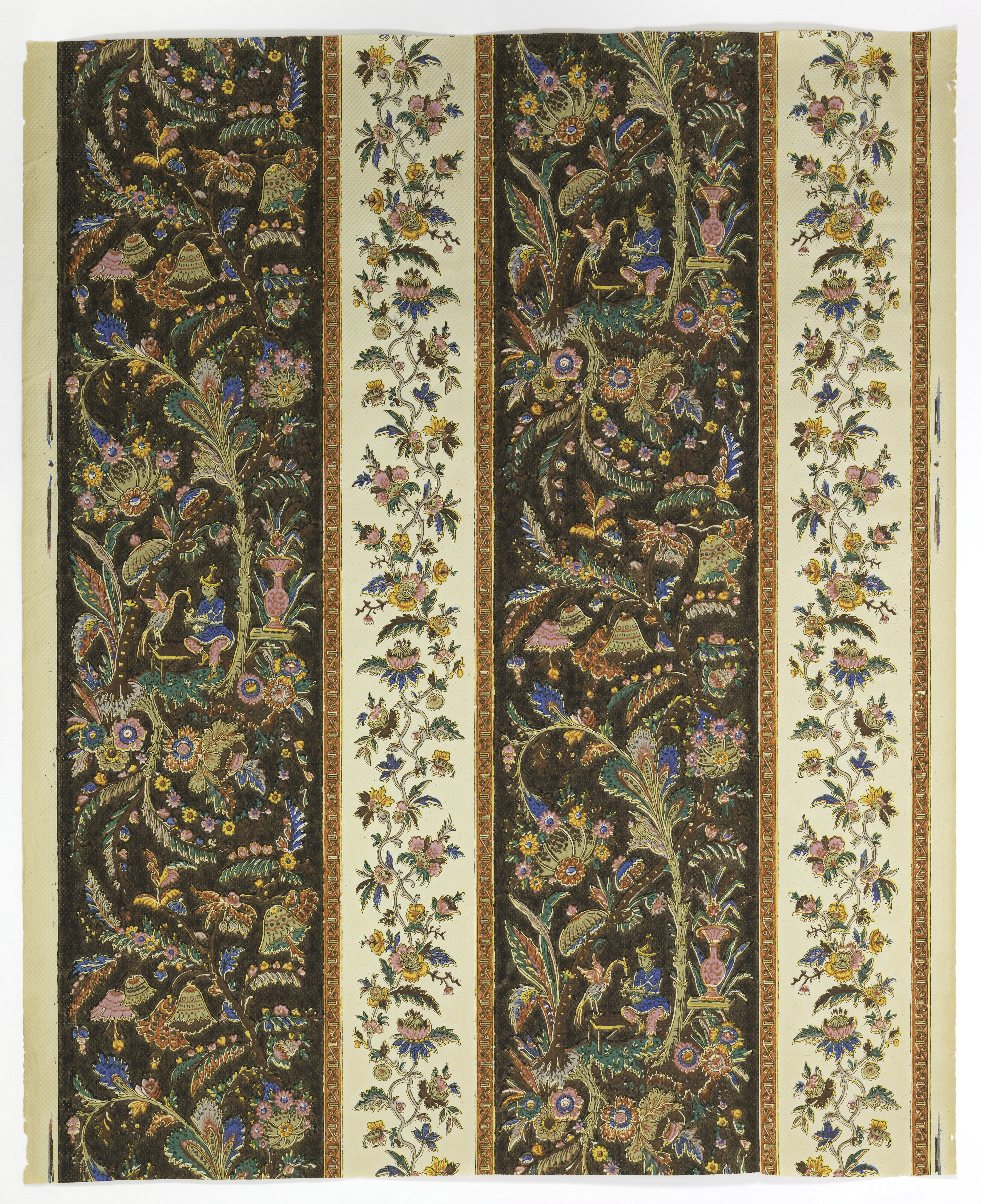 This is a Curtain paper. It is dated 1870–1880 and we acquired it in 1961. Its medium is block-printed, gauffre paper. It is a part of the Wallcoverings department.