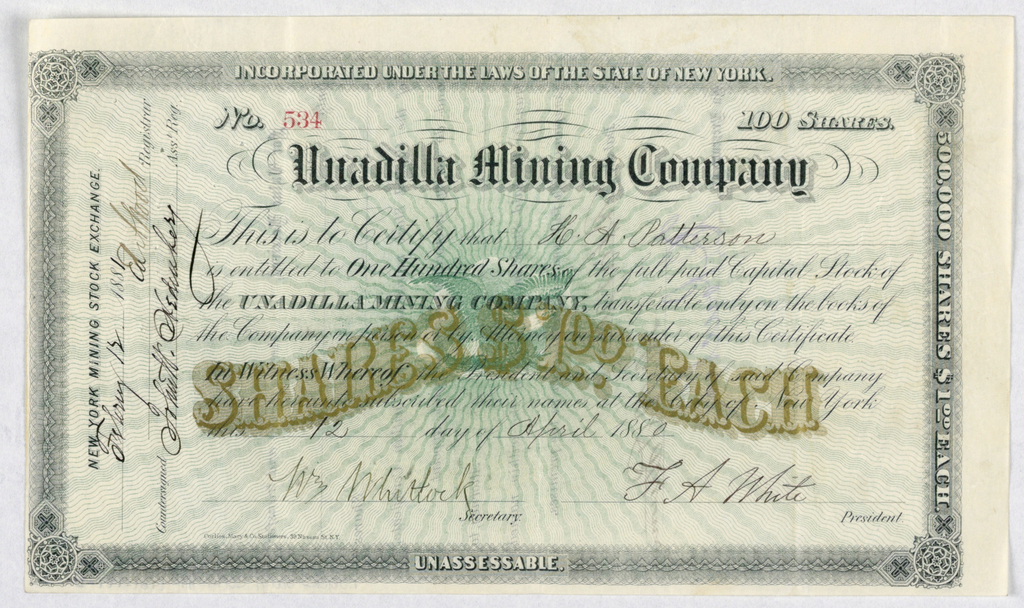Print, Certificate, Unadilla Mining Company, New York Mining Stock Exchange; 1961-179-3