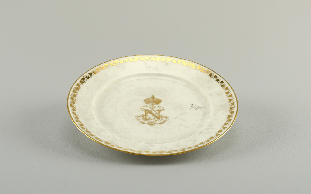 Front of plates: [1] central crowned "N" entwined with interlaced L's in foliate scrollwork, printed in gold (the "N" for Napoleon)