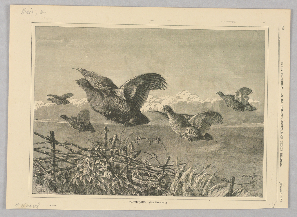 Print, Partridge, Illustration for Every Saturday (I, October 1, 1870, p. 632); Engraved by H. Harral (English, active 1870 – 1875); After Harrison William Weir (English, 1824 – 1906); Published by Every Saturday; USA; wood engraving in black ink on paper; Overall: 26.1 x 37.1 cm (10 1/4 x 14 5/8 in.); Museum purchase through gift of James O. Green; 1961-77-1