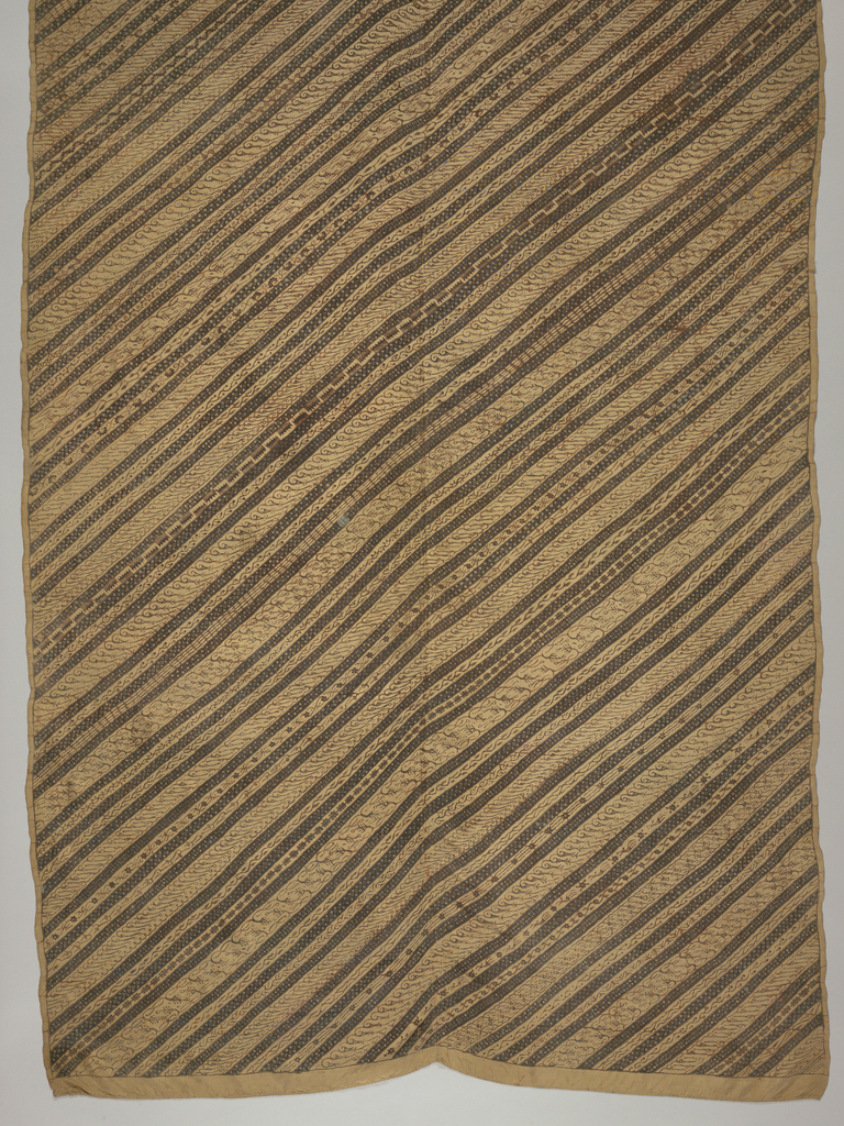This is a Kain panjang (long sarong). It is dated late 19th–early 20th century and we acquired it in 1962. Its medium is silk and its technique is wax resist dyeing (batik) on plain weave. It is a part of the Textiles department.