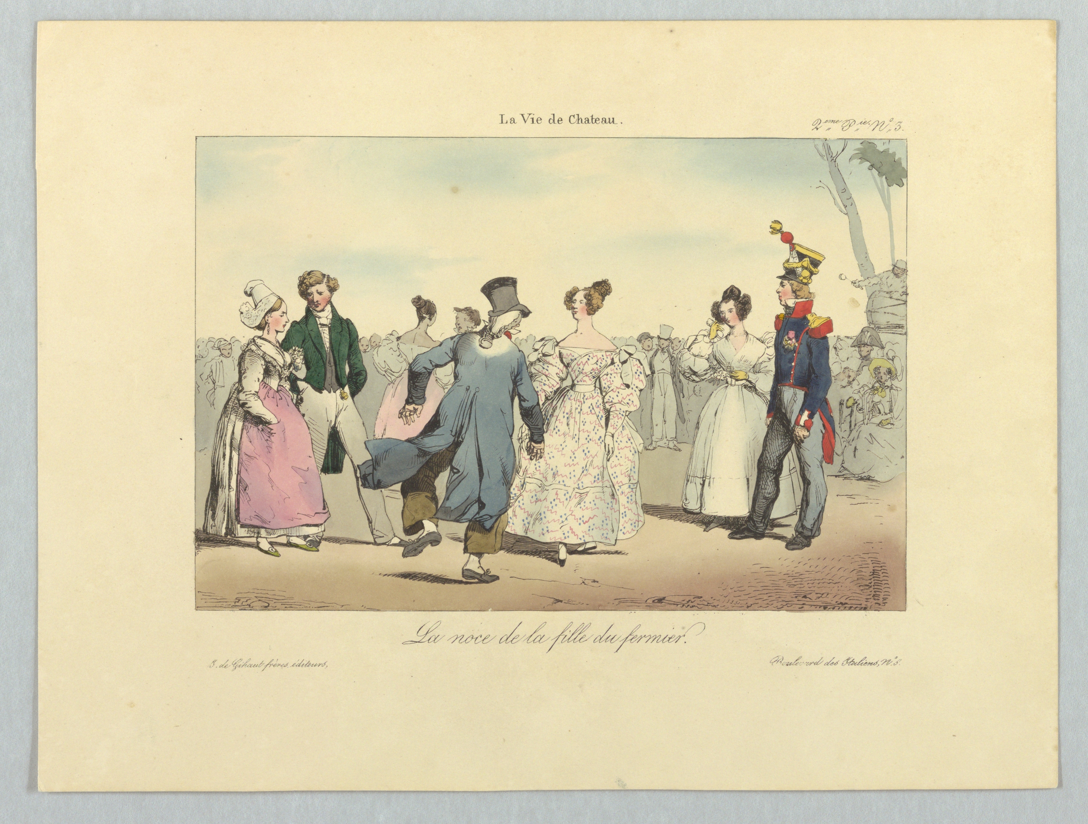 Print, La noce de la fille du fermies, from La vie de château; After Eugène Louis Lami (French, 1800 - 1890); Published by Lami-Denozan Libraire; Print Maker: Gihaut Frères; lithograph, brush and watercolor on paper; 25.2 × 33.4 cm (9 15/16 × 13 1/8 in.); Gift of Hamill and Barker; 1962-143-67
