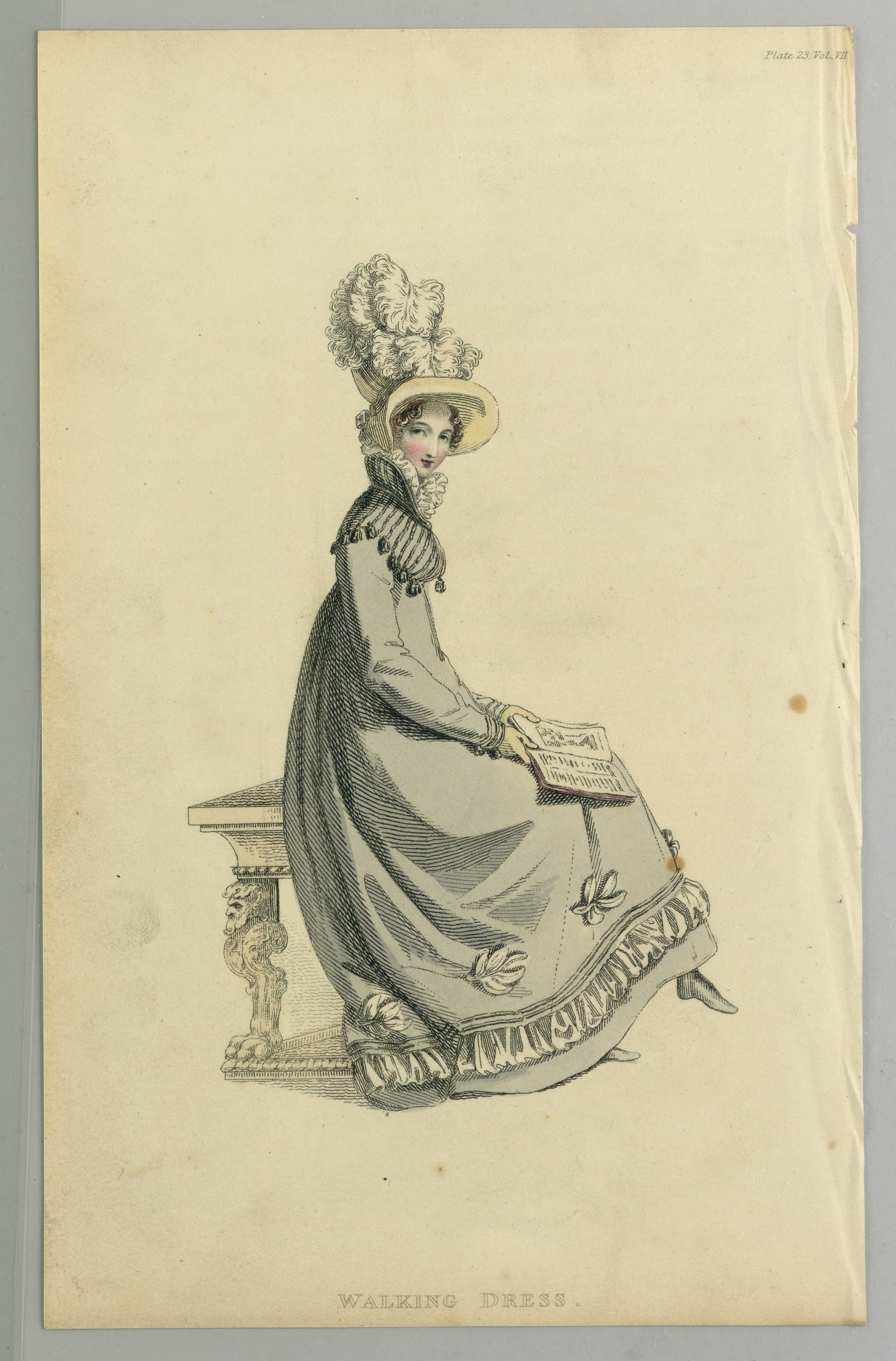 Print, Walking Dress; Published by Rudolph Ackermann (English, b. Germany, 1764–1834); engraving, brush and watercolor on paper; 22.7 × 14.3 cm (8 15/16 × 5 5/8 in.); Gift of Hamill and Barker; 1962-143-7