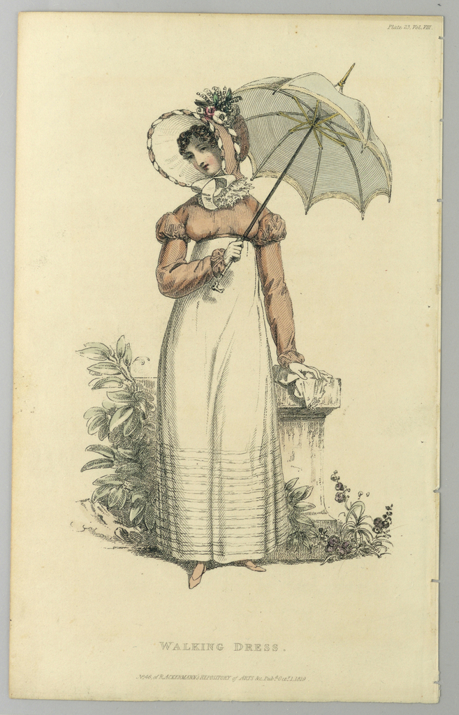 Print, Walking Dress; Published by Ackermann’s, Rudolph Ackermann (English, b. Germany, 1764–1834); engraving, brush and watercolor on paper; 23.8 × 14.7 cm (9 3/8 × 5 13/16 in.); Gift of Hamill and Barker; 1962-143-9