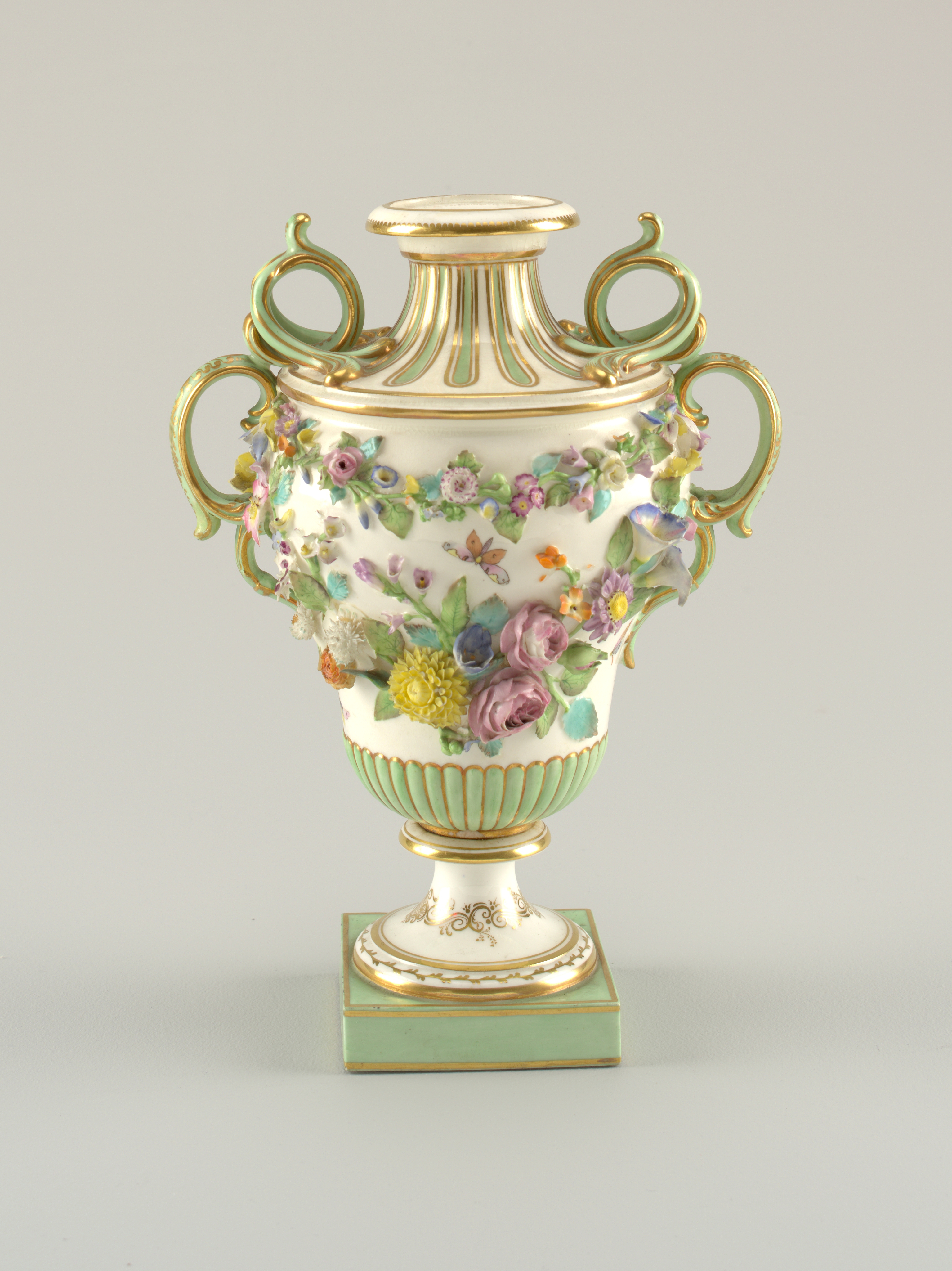 This is a urn. It was manufactured by Coalport Porcelain Factory. It is dated ca. 1830 and we acquired it in 1962. Its medium is porcelain, vitreous enamel, gold. It is a part of the Product Design and Decorative Arts department.