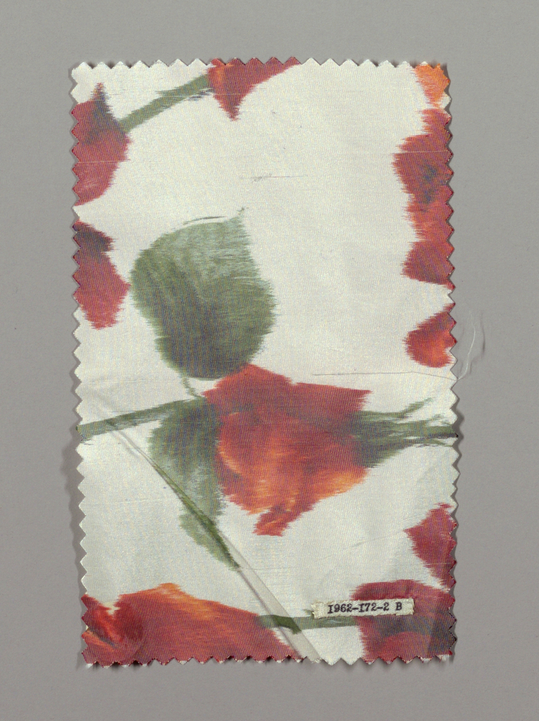 This is a Textile. It was manufactured by Les Petit Fils de C.J. Bonnet. It is dated 1962 and we acquired it in 1962. Its medium is silk and its technique is warp printed taffeta. It is a part of the Textiles department.