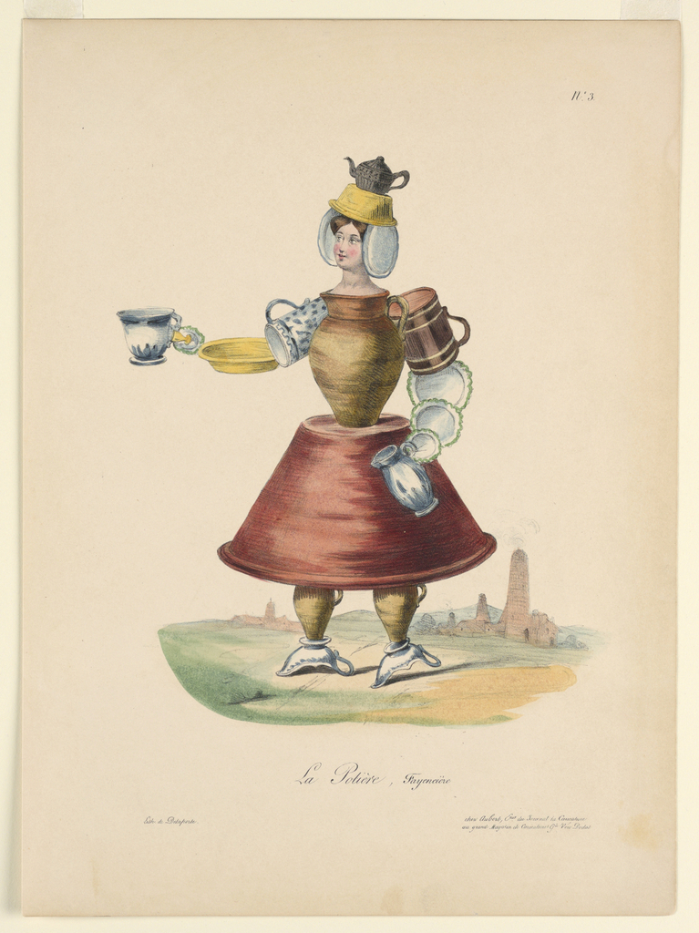 Print, La Potière, Fayencière, No. 3 (Journal la Caricature); Published by Chez Aubert and Co.; Lithographer: Delaporte; France; hand-colored lithograph; 1962-173-2-c