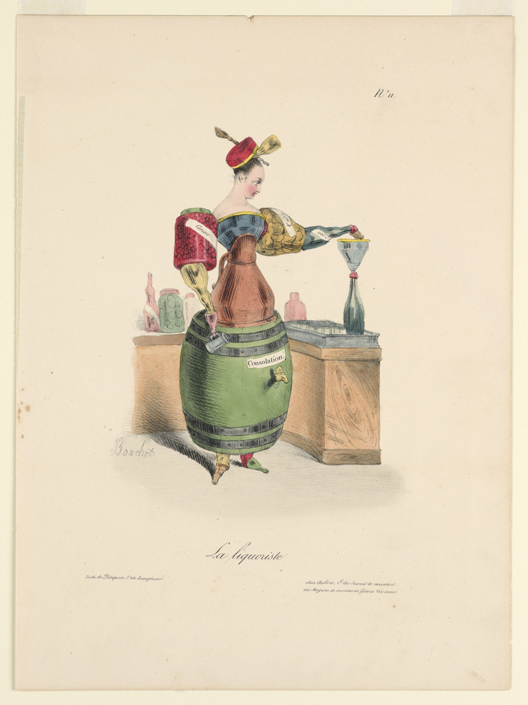 Print, La Liquoriste, No. 11 (Journal la Caricature); Published by Chez Aubert and Co.; Lithographer: Delaporte; France; hand-colored lithograph; 1962-173-2-k