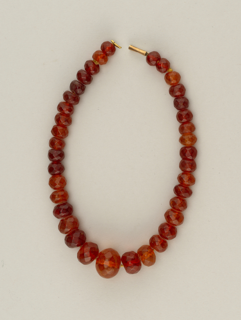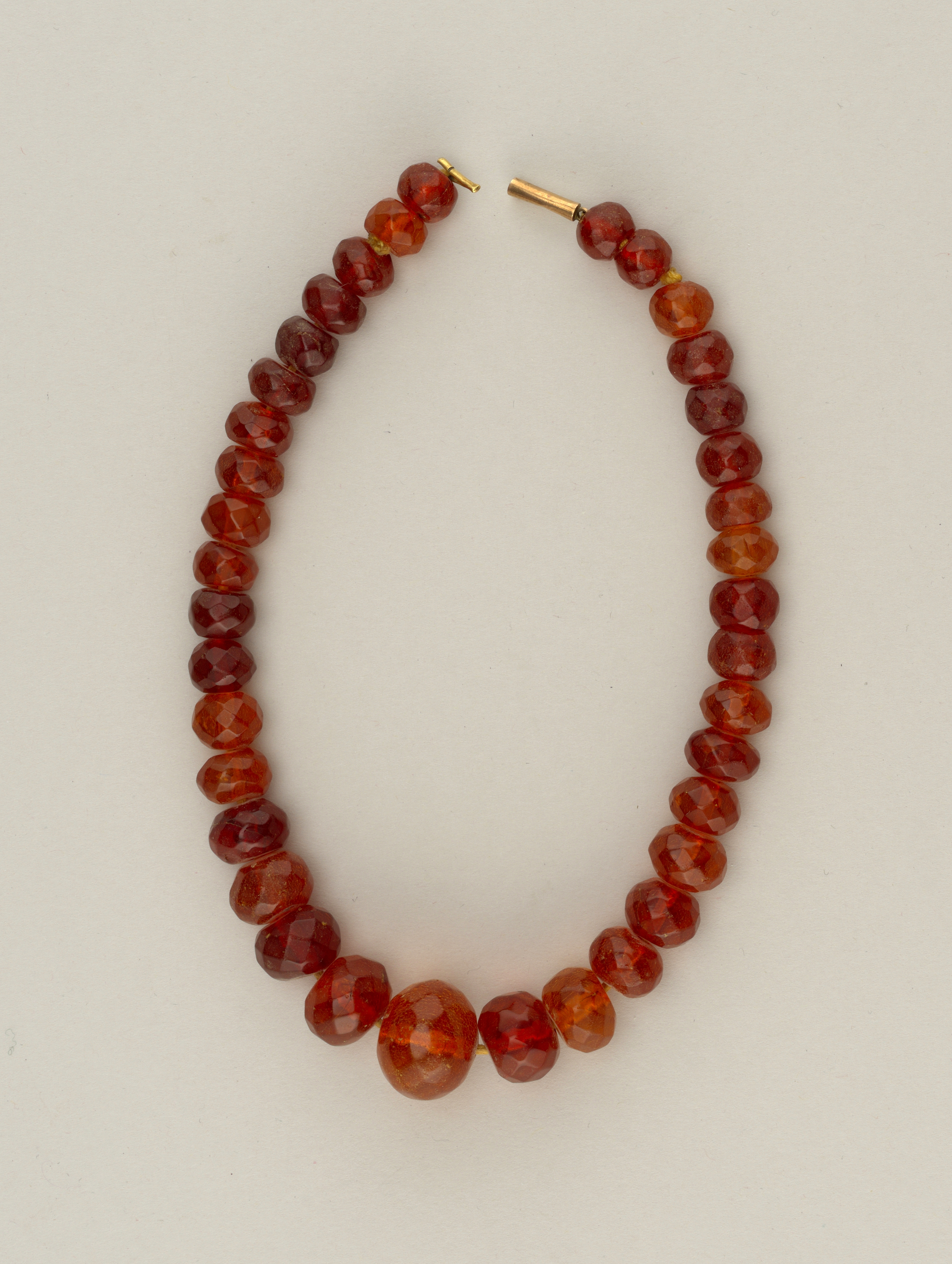 This is a necklace. It is dated early 20th century and we acquired it in 1962. Its medium is amber. It is a part of the Product Design and Decorative Arts department.