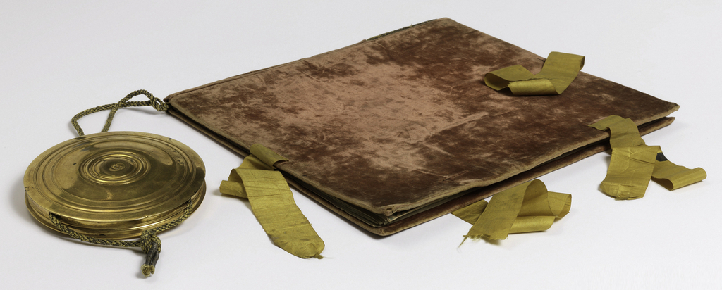 Calligraphy, Certificate of Authorization for the Title of "Von" for Johann Ferdinand Richter; Engraved by Franz Mayer (Austrian, active 1700s); Austria; pen and ink, brush and watercolor over engraving on vellum, bound in velvet-covered boards with imperial seal in brass case; (closed): 37 x 33 cm (14 9/16 in. x 13 in.) (diam. of case): 14.9 cm (5 7/8 in.); Museum purchase through gift of Erskine Hewitt; 1962-194-1