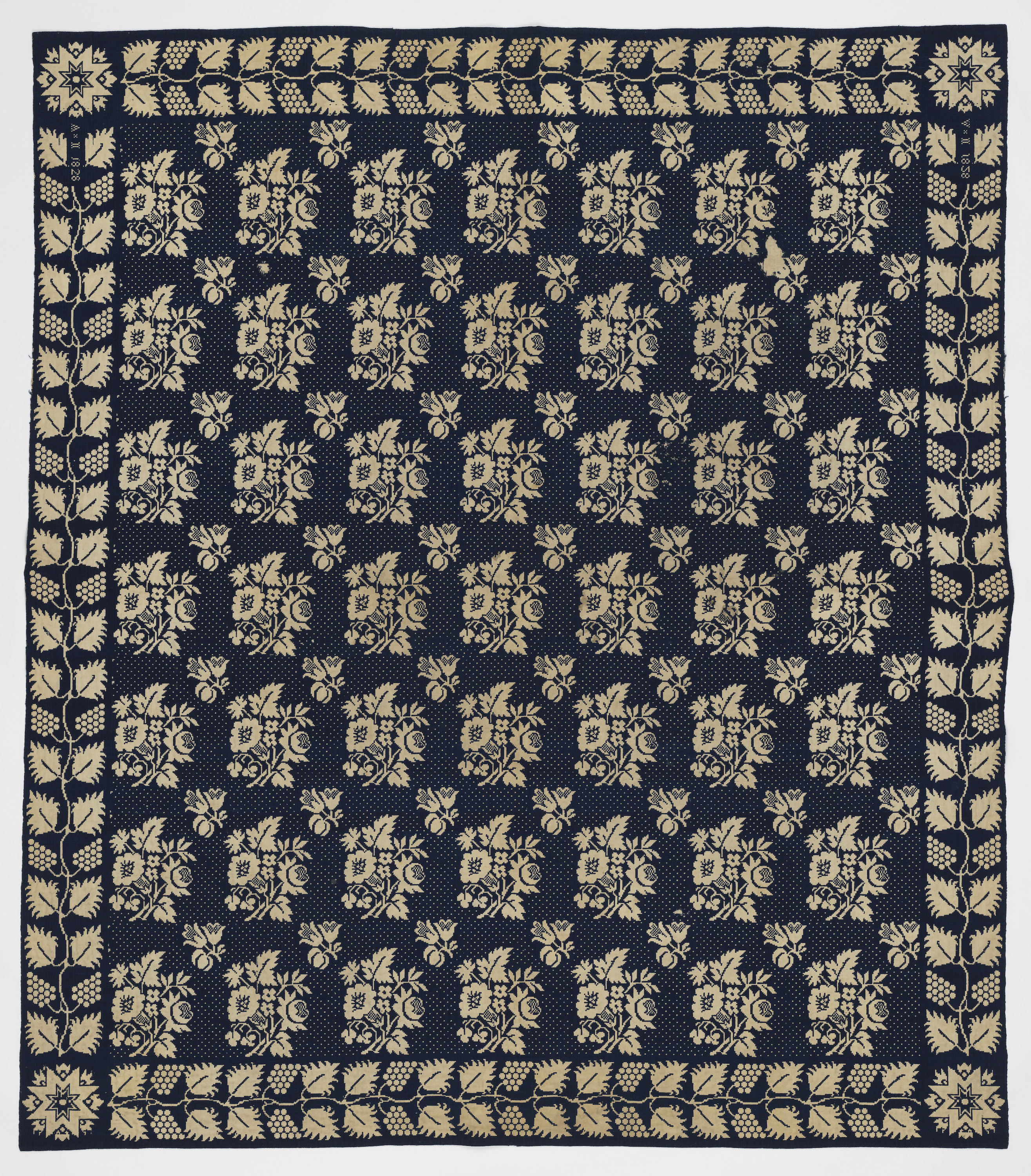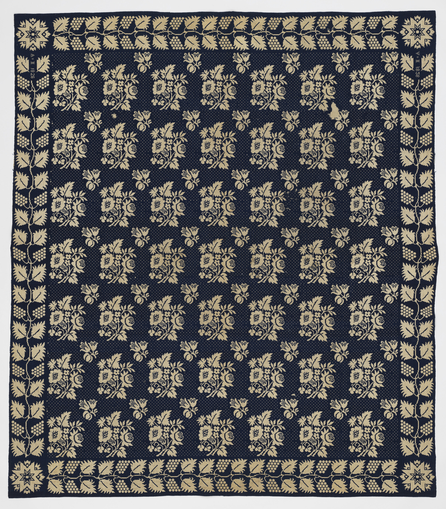 This is a Coverlet. It is dated 1828 and we acquired it in 1962. Its medium is cotton, wool and its technique is double cloth. It is a part of the Textiles department.