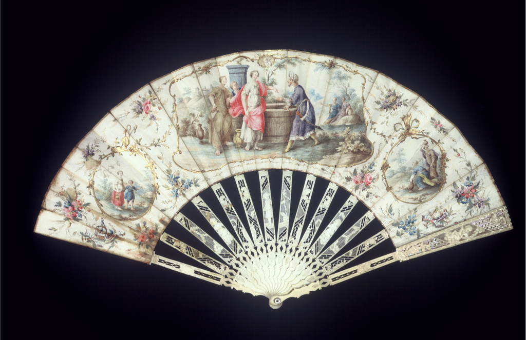 This is a Pleated fan. It is dated late 18th century and we acquired it in 1962. Its medium is parchment leaf painted with watercolors, carved ivory sticks, wood splints, mother-of-pearl washer. It is a part of the Textiles department.