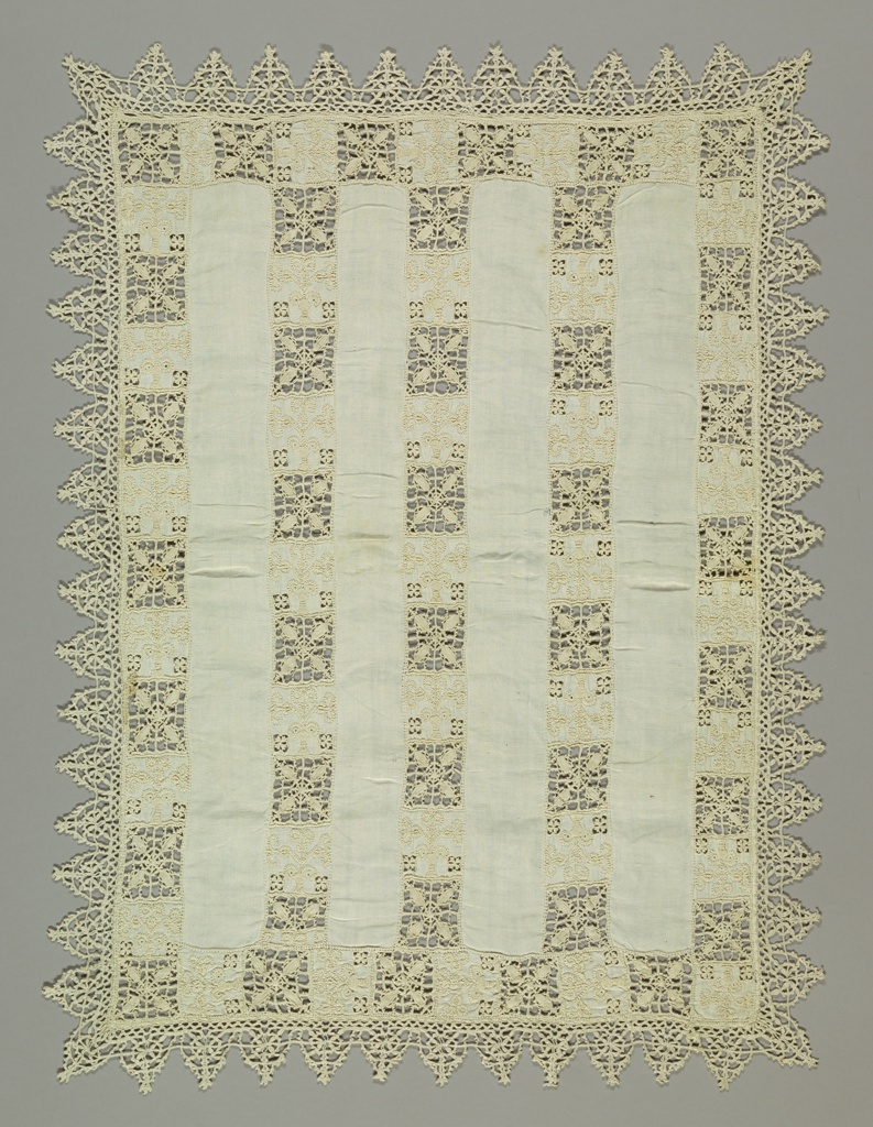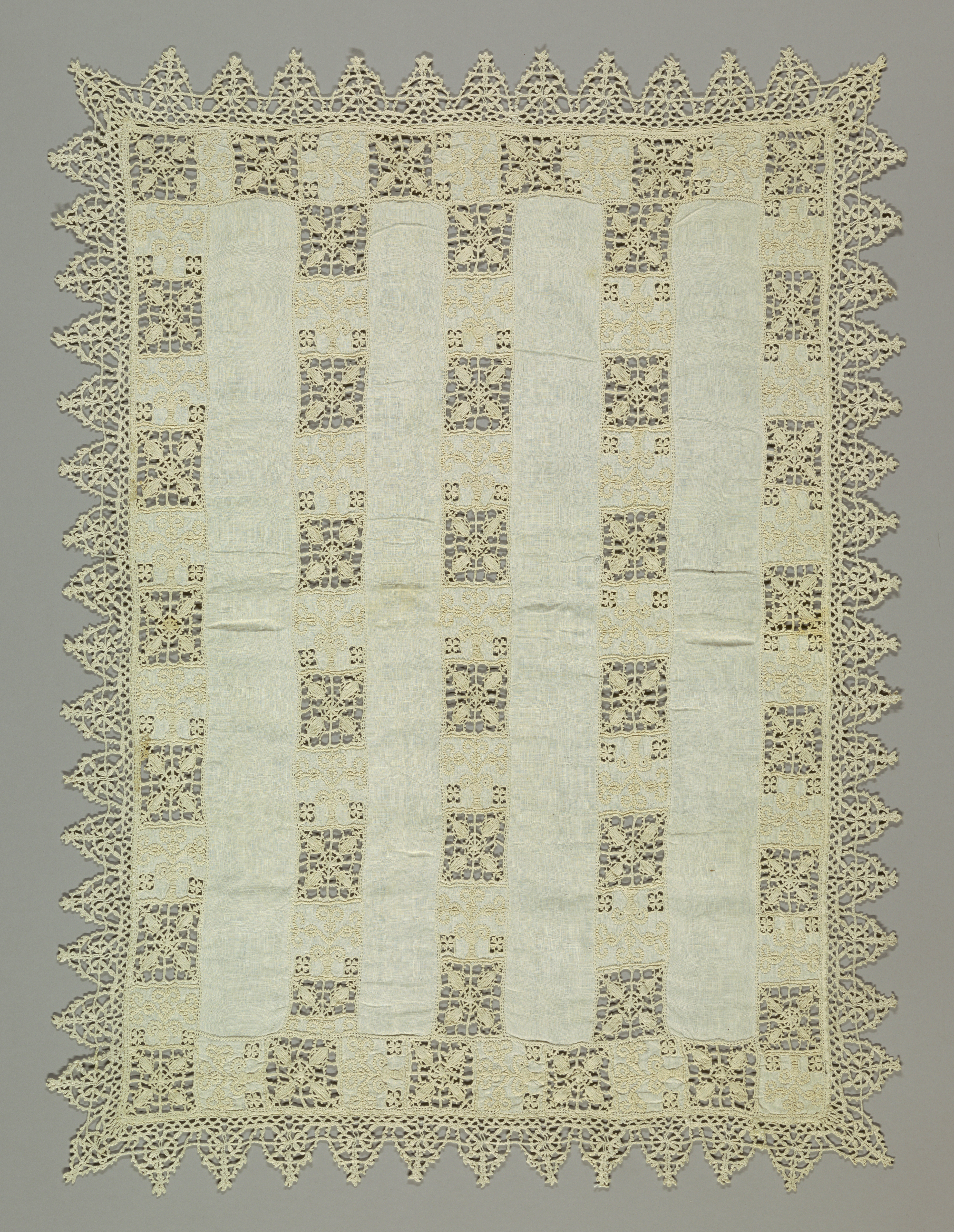 This is a Chalice cover. It is dated mid-17th century and we acquired it in 1962. Its medium is linen and its technique is grid of withdrawn element work with reticella style needle lace, embroidery and bobbin lace trim. It is a part of the Textiles department.