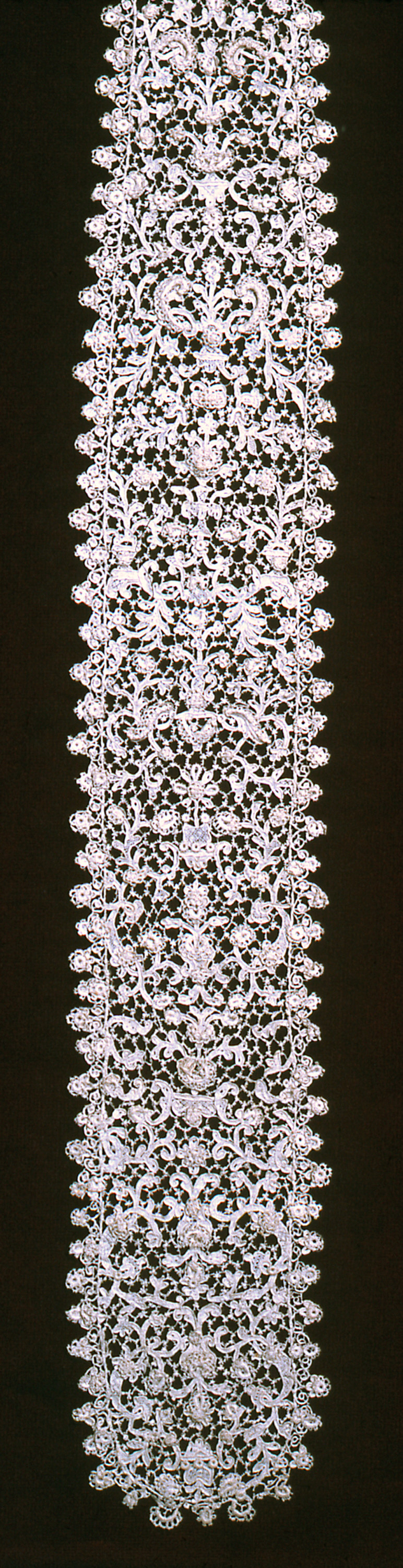 This is a Cap streamer. It is dated 1690s and we acquired it in 1962. Its medium is linen and its technique is needle lace. It is a part of the Textiles department.