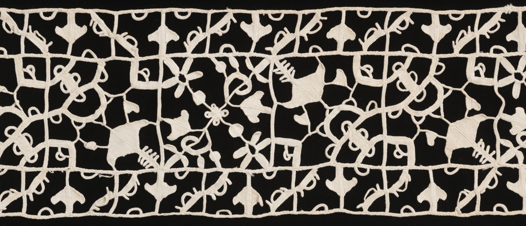 This is a Band. It is dated early 17th century and we acquired it in 1962. Its medium is linen and its technique is grid of laid cords with needle lace (reticella style). It is a part of the Textiles department.