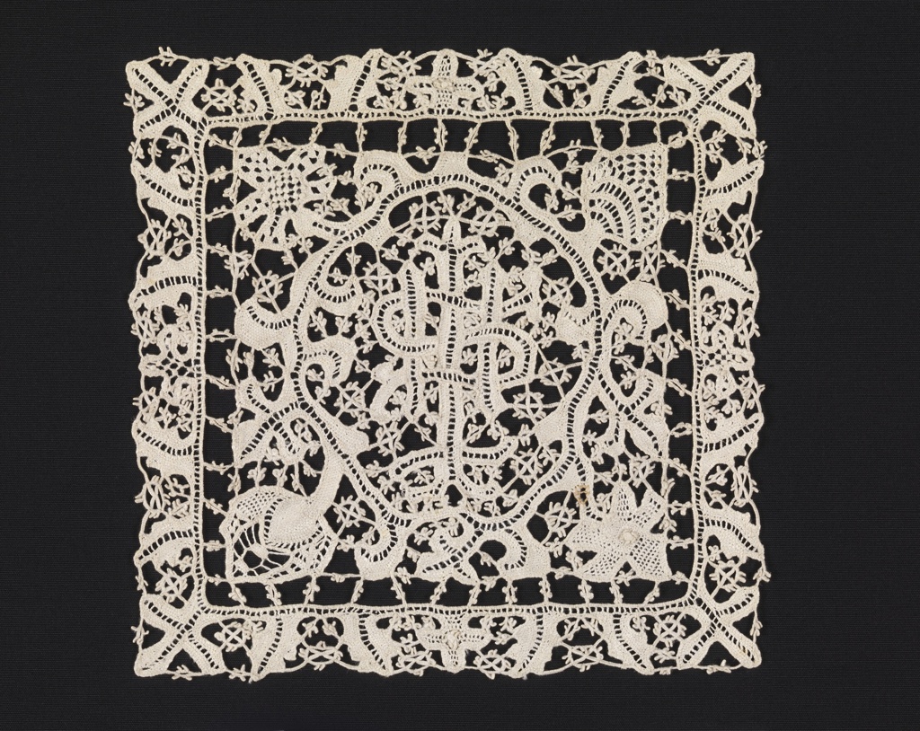 This is a Chalice cover. It is dated late 16th–early 17th century and we acquired it in 1962. Its medium is linen and its technique is needle lace. It is a part of the Textiles department.