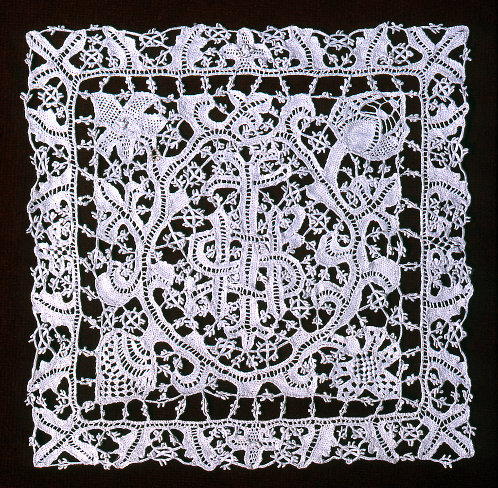 This is a Chalice cover. It is dated late 16th–early 17th century and we acquired it in 1962. Its medium is linen and its technique is needle lace. It is a part of the Textiles department.