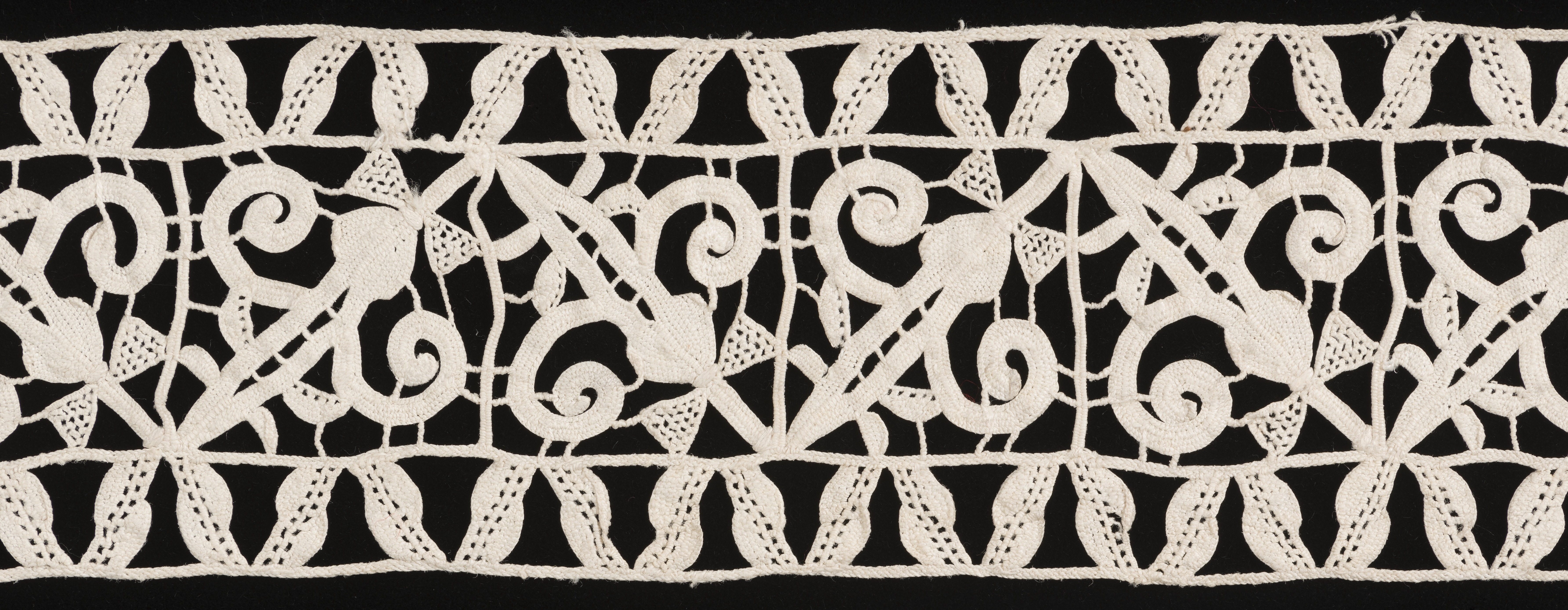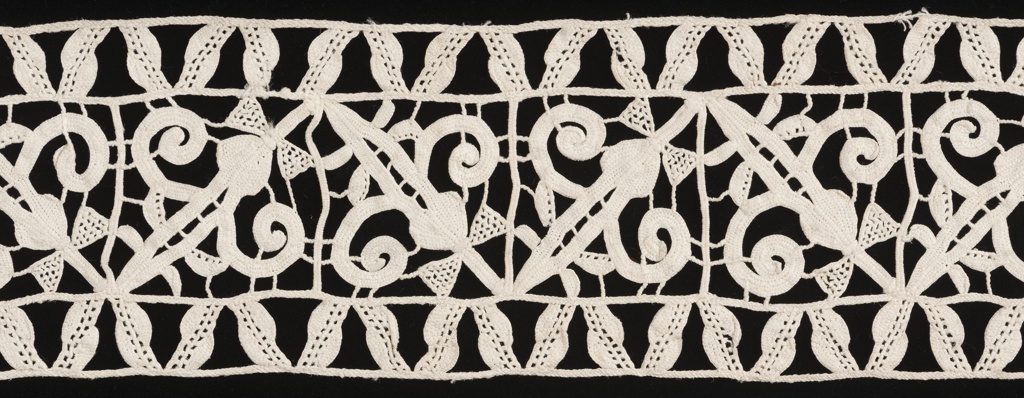 This is a Border. It is dated late 16th–early 17th century and we acquired it in 1962. Its medium is linen and its technique is grid of laid cords with needle lace (reticella style). It is a part of the Textiles department.