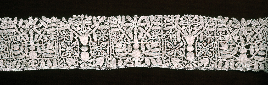 This is a Border. It is dated late 16th–early 17th century and we acquired it in 1962. Its medium is linen and its technique is grid of laid cords with needle lace (reticella style). It is a part of the Textiles department.
