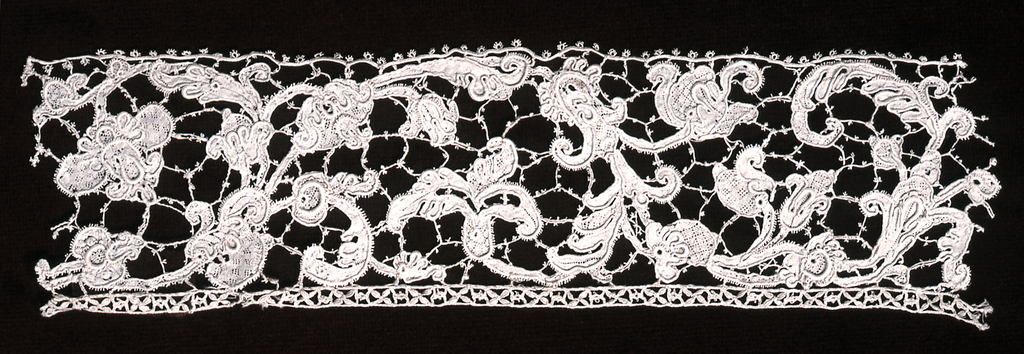 This is a Fragment. It is dated late 17th–early 18th century and we acquired it in 1962. Its medium is linen and its technique is raised needle lace. It is a part of the Textiles department.