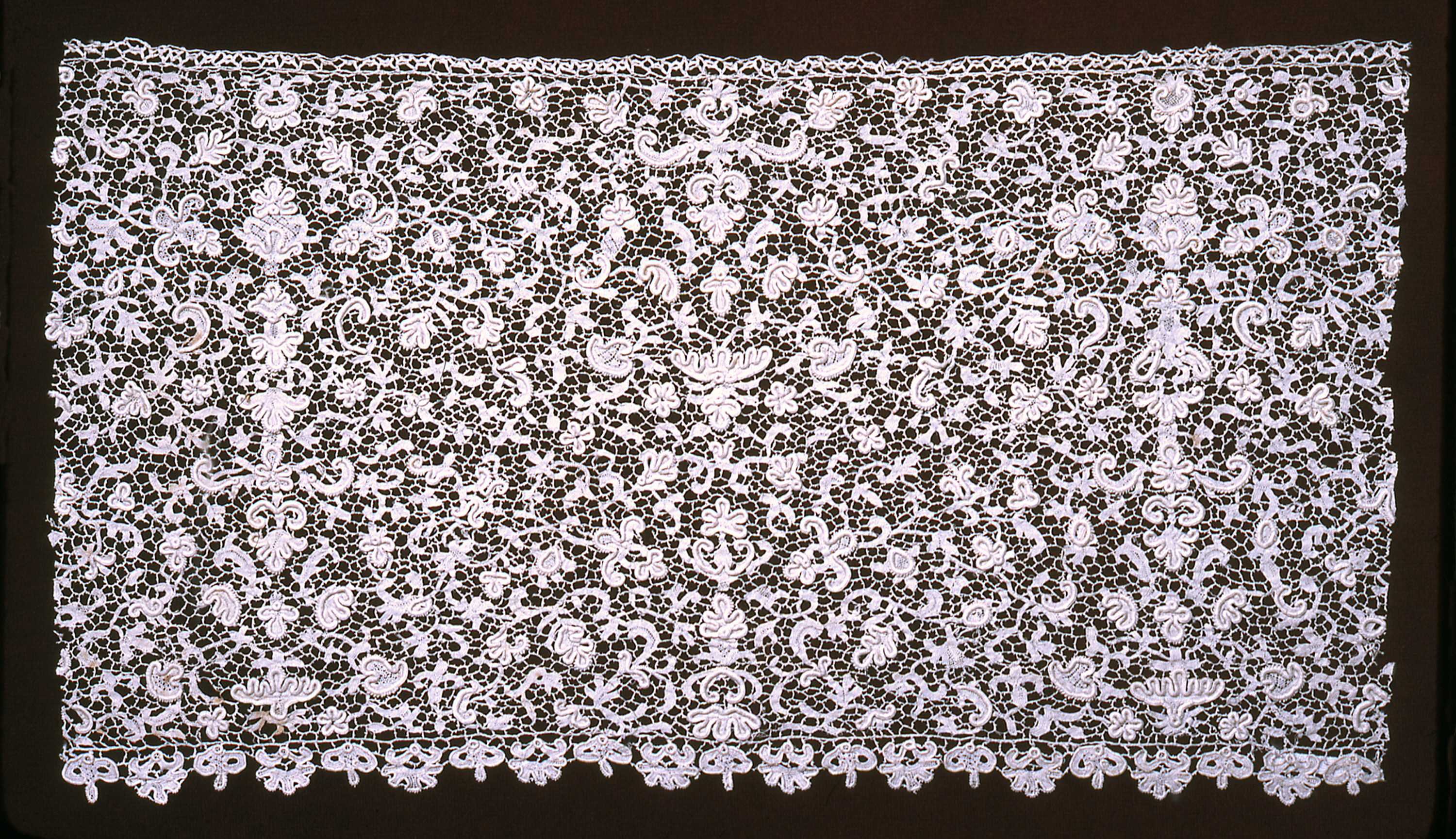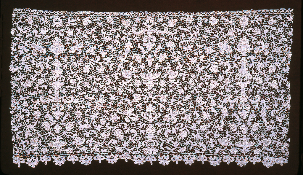 This is a Flounce. It is dated early 18th century and we acquired it in 1962. Its medium is linen and its technique is needle lace, 6 sided reworked grounds. It is a part of the Textiles department.