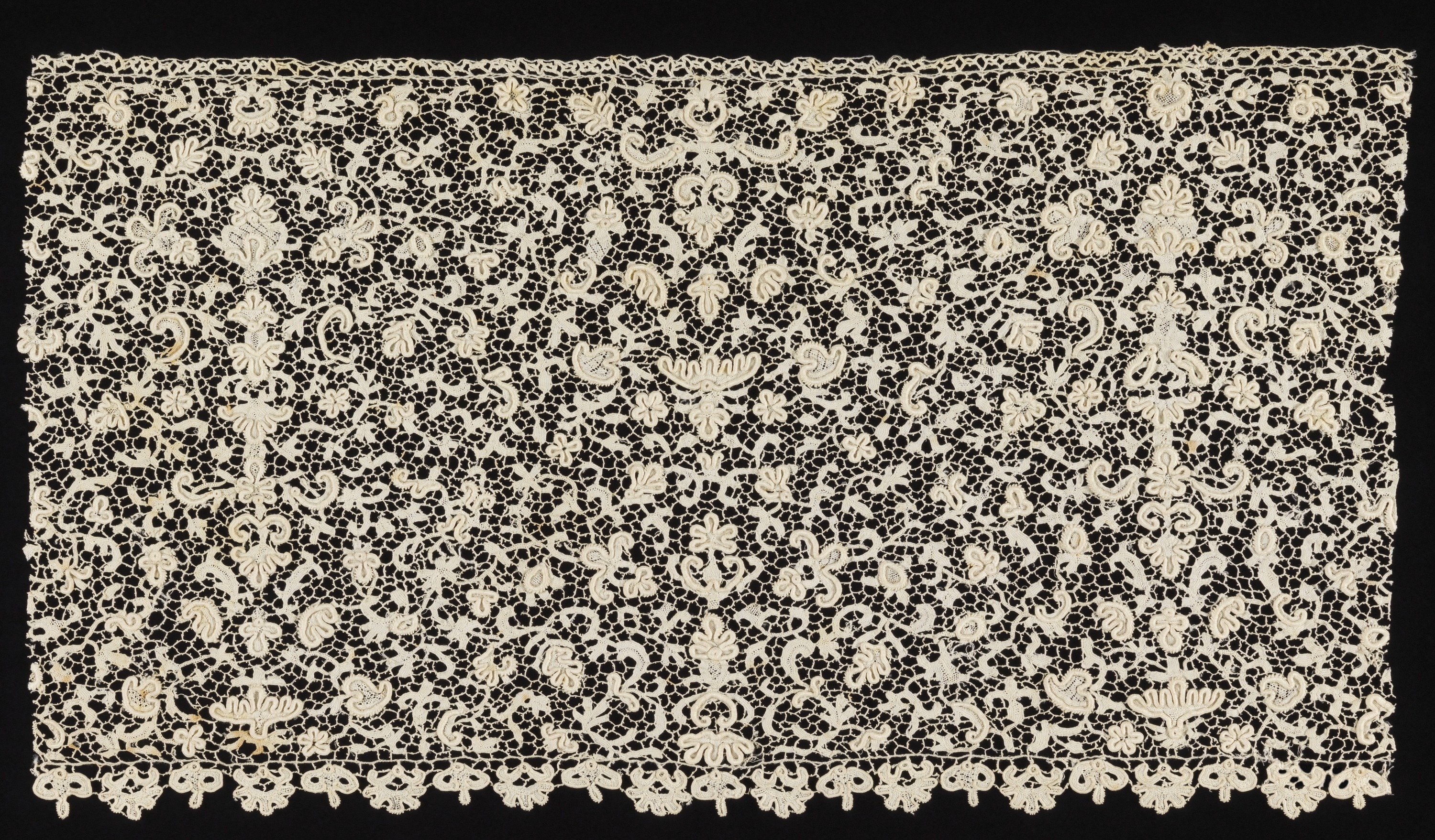 This is a Flounce. It is dated early 18th century and we acquired it in 1962. Its medium is linen and its technique is needle lace, 6 sided reworked grounds. It is a part of the Textiles department.