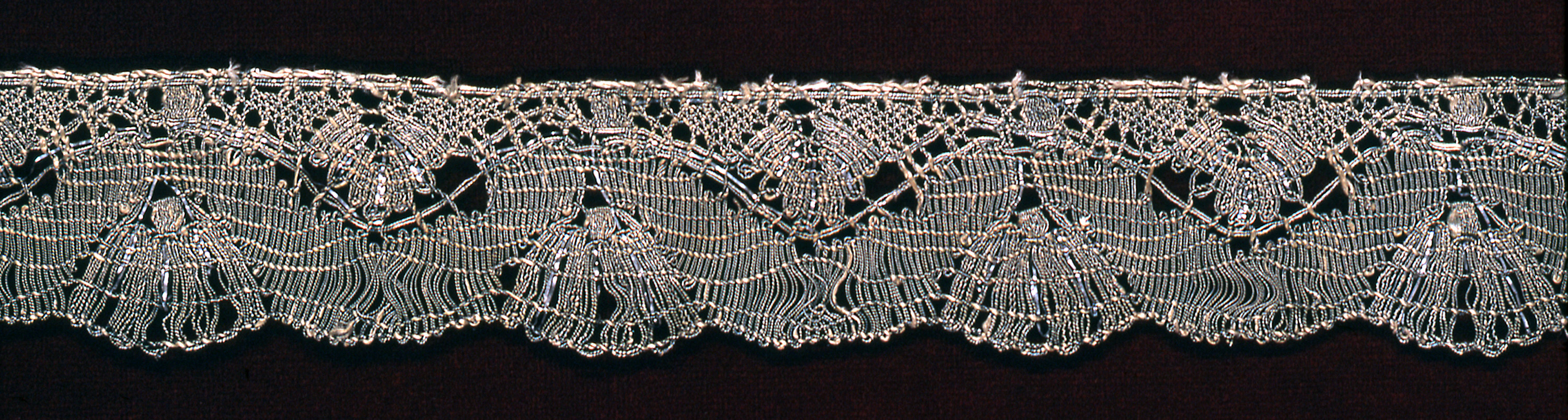 This is a Trimming. It is dated late 17th–early 18th century and we acquired it in 1962. Its medium is metallic strips wrapped around linen core and its technique is bobbin lace. It is a part of the Textiles department.