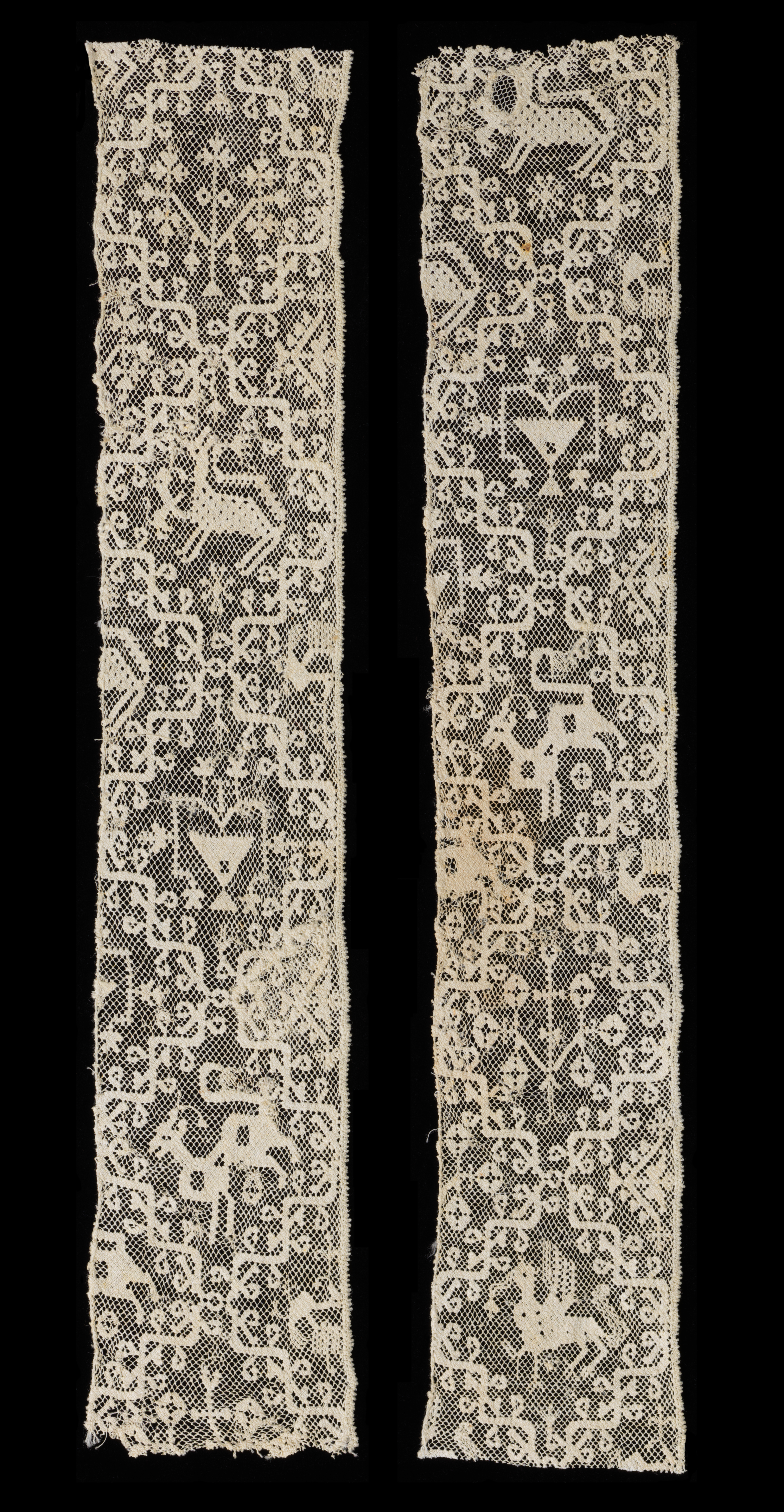 This is a Bands. It is dated 16th century and we acquired it in 1962. Its medium is linen and its technique is interlacing stitch on knotted net with a narrow interlooped band sewn to an intact edge of the net (needlework on knotted net). It is a part of the Textiles department.