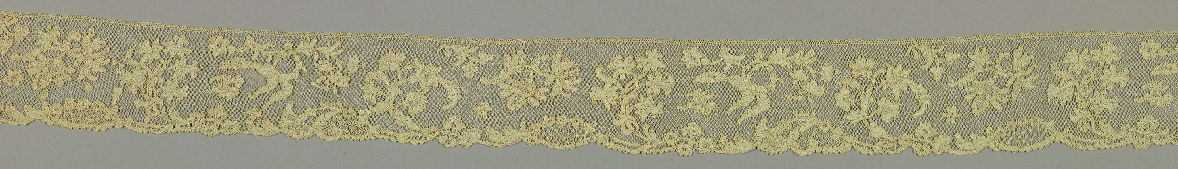 This is a Border. It is dated mid-18th century and we acquired it in 1962. Its medium is linen and its technique is needle lace with 6 sided reworked ground. It is a part of the Textiles department.