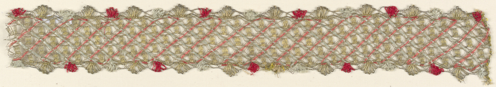 This is a Fragment. It is dated mid-18th century and we acquired it in 1962. Its medium is metallic, silk and its technique is bobbin lace, metallic. It is a part of the Textiles department.