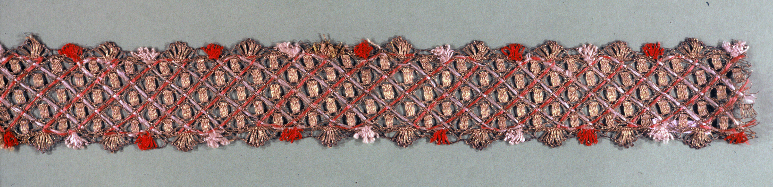 This is a Fragment. It is dated mid-18th century and we acquired it in 1962. Its medium is metallic, silk and its technique is bobbin lace, metallic. It is a part of the Textiles department.