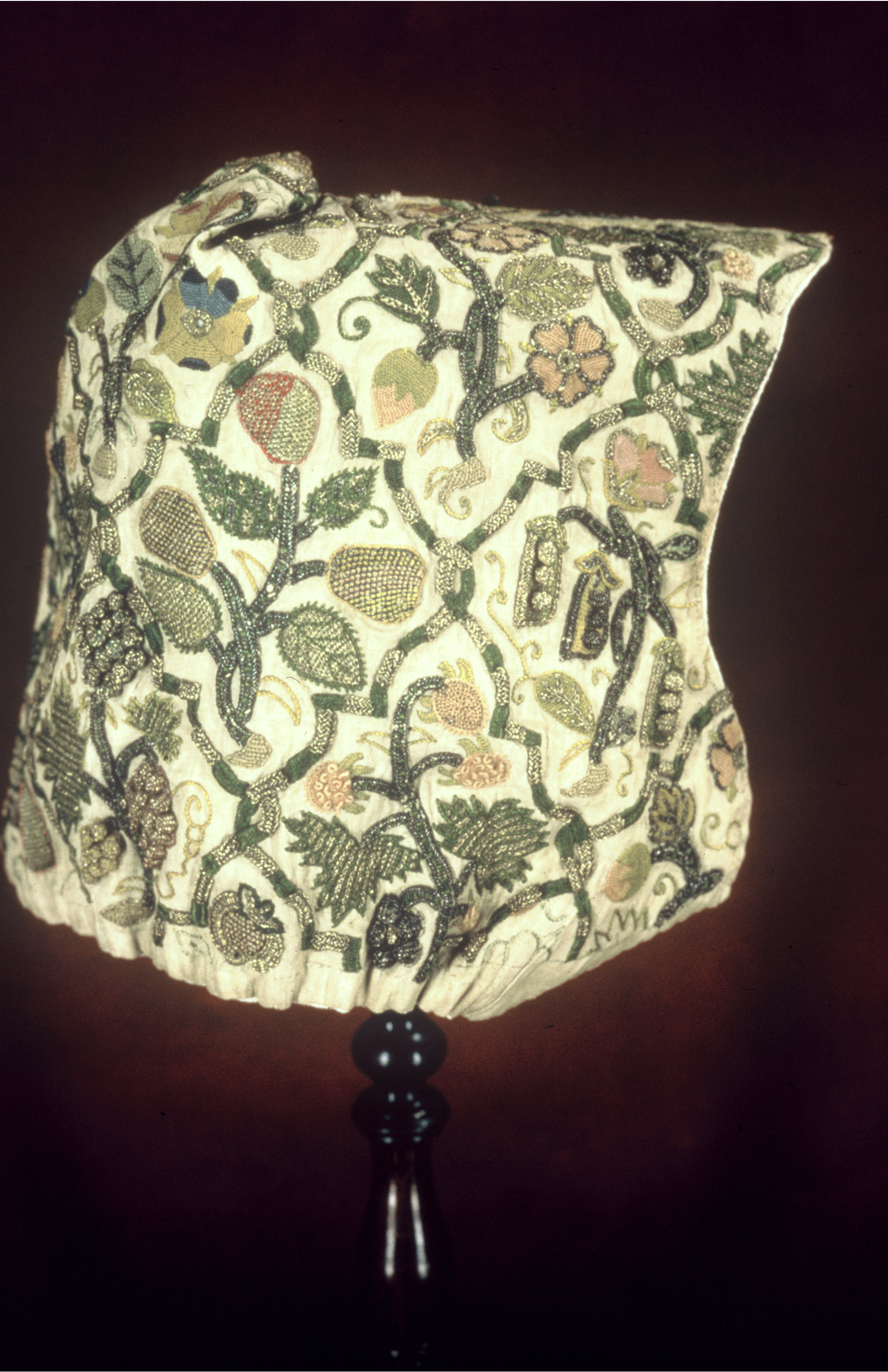 Imagination and creativity show in the embroidery of the 17th century, as shown on this beautiful coif. An everyday head covering worn by women, coifs were the canvas for unique embellishment. On this piece, each each compartment of the intertwined lattice is filled with a different flower, fruit or vegetable worked in silk and gold or silver metallic threads. There are many imaginative uses of threads and stitches to be seen. For example, the pears were first worked with metal thread in a needle lace stitch that filled in the entire shape, but to provide shading and dimension, multiple colors of silk threads were interwoven into the metal thread work. The creativity continues with the raised peas and grapes, worked using a stitch called a spider’s web. The forms actually stand off the surface by over a quarter inch, defying the known instructions for the stitch. When originally made, the bright sparkle of the gold and silver combined with the colored silks would have made this piece quite a statement.