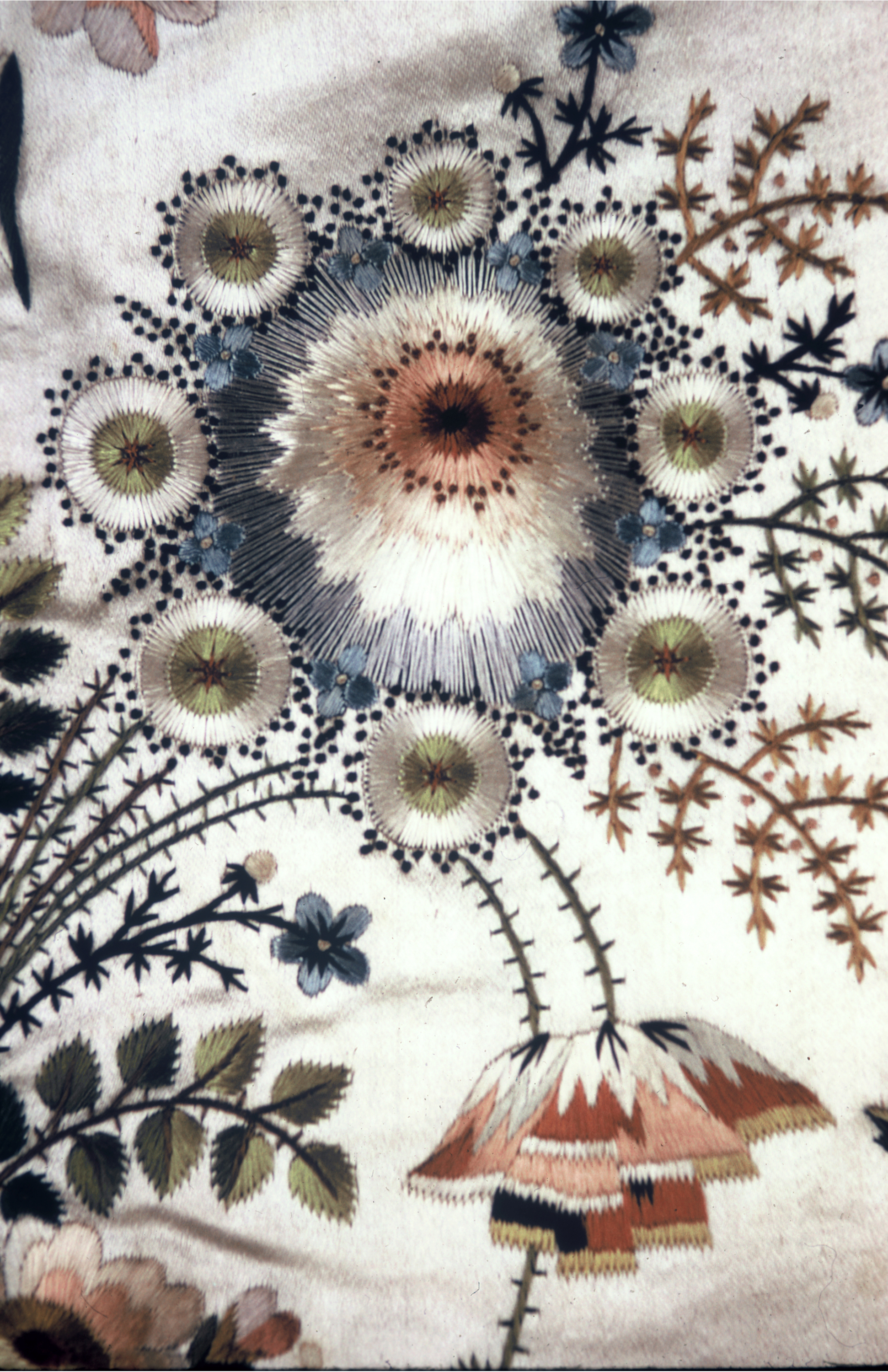 This is a Waistcoat. It is dated 1770–1785 and we acquired it in 1962. Its medium is silk and its technique is satin, stem and knot stitches in twenty colors of silk on silk 7&1 satin foundation; applique of machine-made net areas of painted silk underneath embroidery and applique. It is a part of the Textiles department.