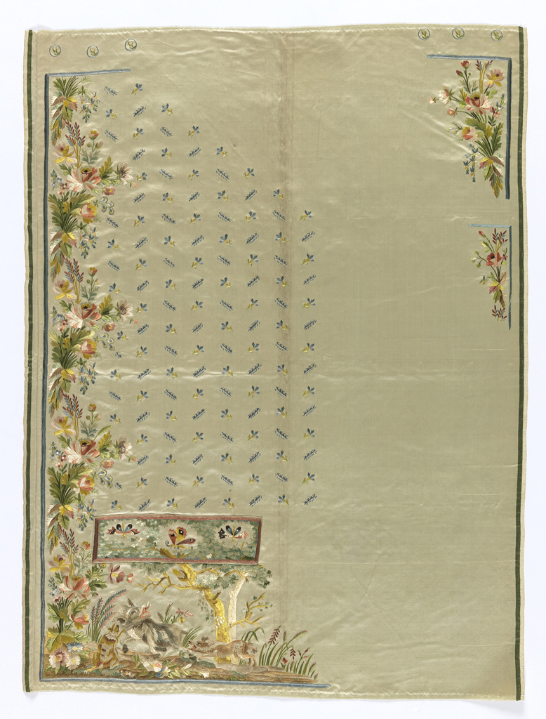 This is a Waistcoat fronts. It is dated 1770–80 and we acquired it in 1962. Its medium is silk, paint and its technique is embroidery using float, satin and chain stitch, painted details. It is a part of the Textiles department.