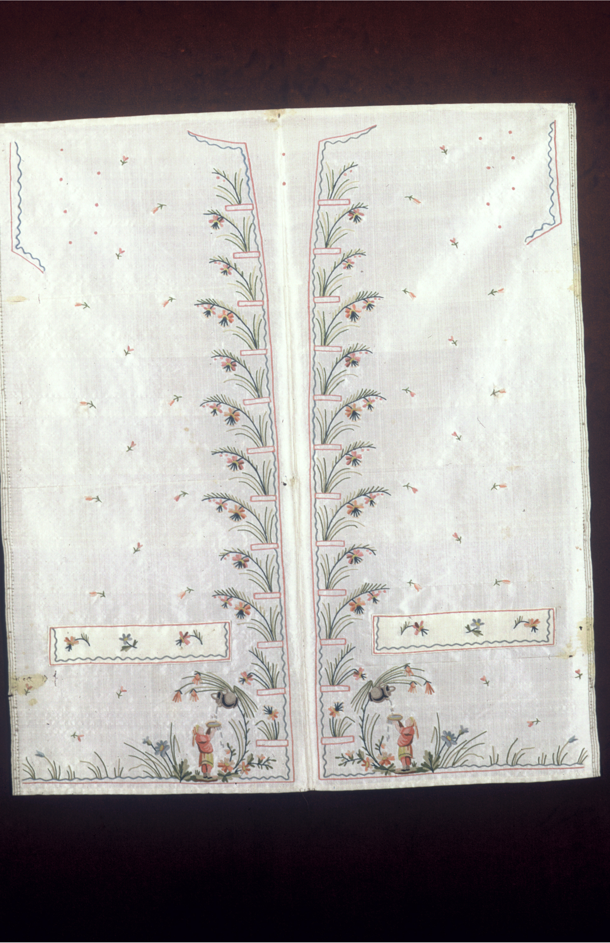 This is a Waistcoat. It is dated 1780–90 and we acquired it in 1962. Its medium is silk and its technique is embroidery in chain stitch made with a tambour hook using 15 colors of silk on silk plain weave foundation. It is a part of the Textiles department.