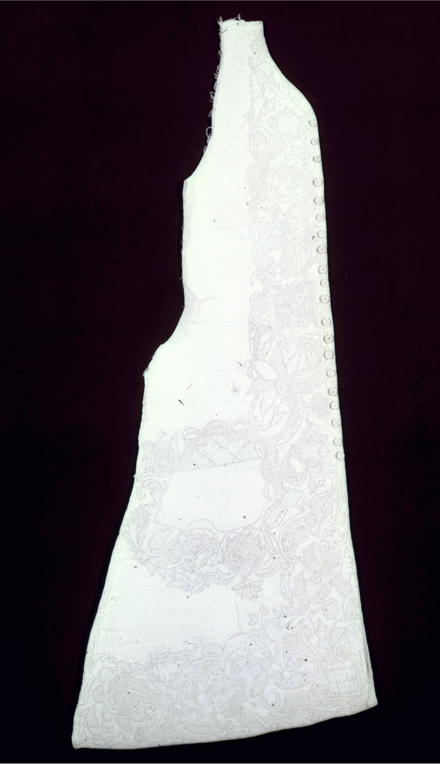 Waistcoat (England); linen; H x W (a): 94.6 × 41.3 cm (37 1/4 × 16 1/4 in.) H x W (b): 92.1 × 40 cm (36 1/4 × 15 3/4 in.) H x W (c): 11.4 × 30.5 cm (4 1/2 in. × 12 in.) H x W (d): 12.1 × 31.8 cm (4 3/4 × 12 1/2 in.) H x W (e): 11.7 × 23.2 cm (4 5/8 × 9 1/8 in.) H x W (f): 13 × 22.9 cm (5 1/8 in. × 9 in.); Bequest of Richard Cranch Greenleaf in memory of his mother, Adeline Emma Greenleaf; 1962-54-65-a/f