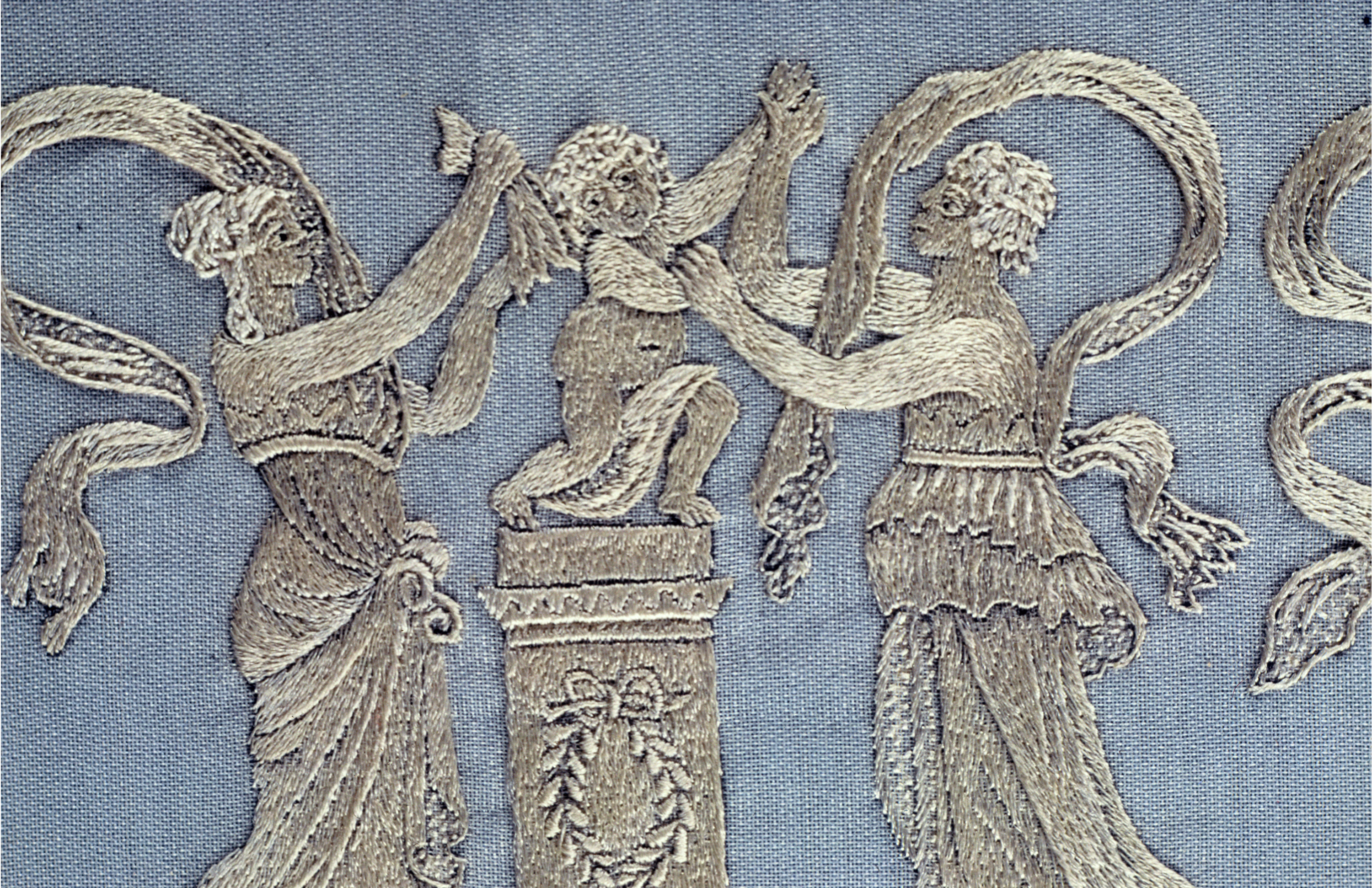 This is a Textile. It is dated early 19th century and we acquired it in 1962. Its medium is silk on cotton and its technique is needlework on gauze weave. It is a part of the Textiles department.