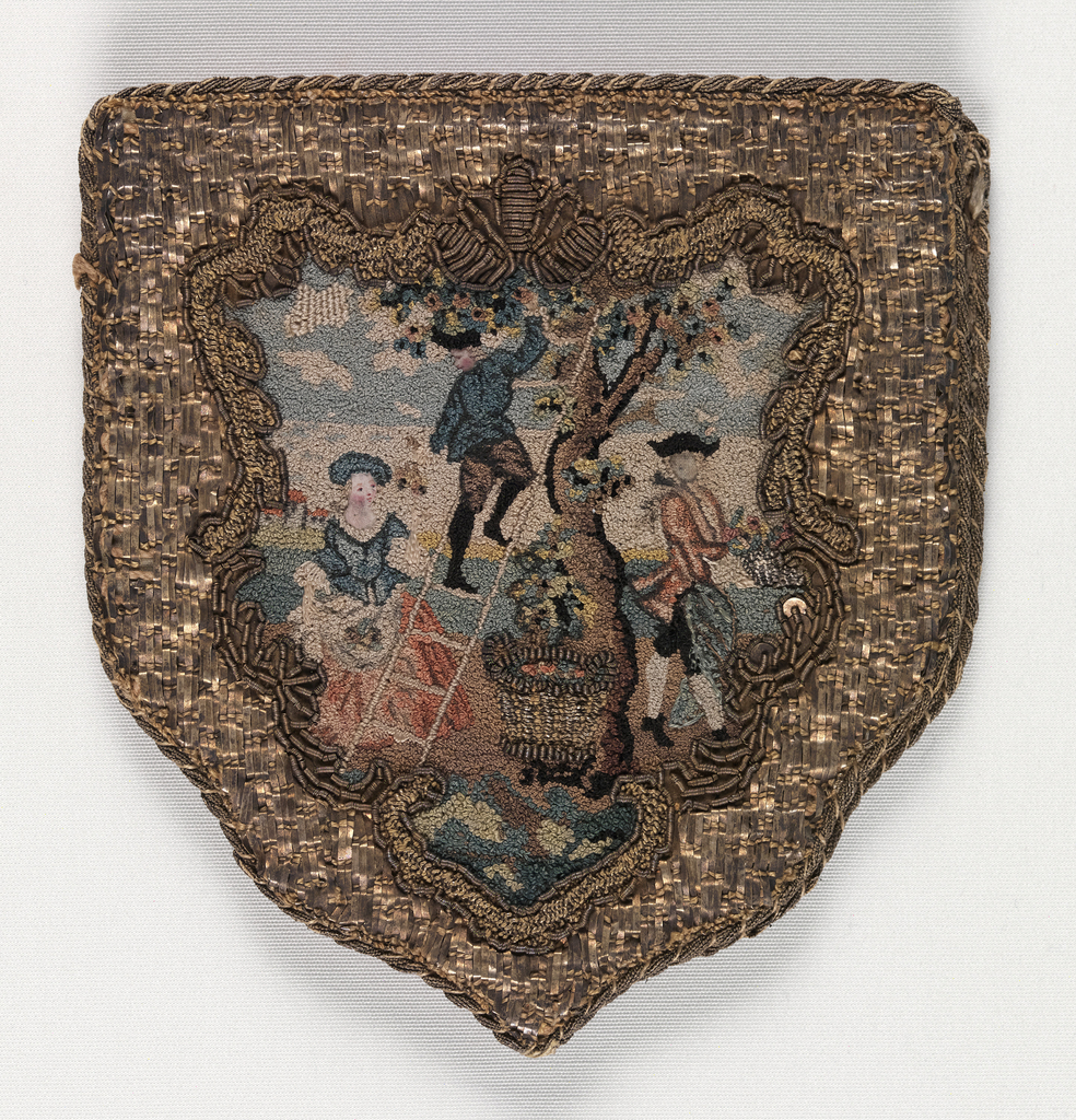 This is a Purse. It is dated mid-18th century and we acquired it in 1962. Its medium is silk and metallic thread embroidery, foil strips, coiled gilt wire, and spangles on silk foundation and its technique is embroidered in running, stem, satin, knotting, and couching stitches on plain weave foundation; faces painted. It is a part of the Textiles department.