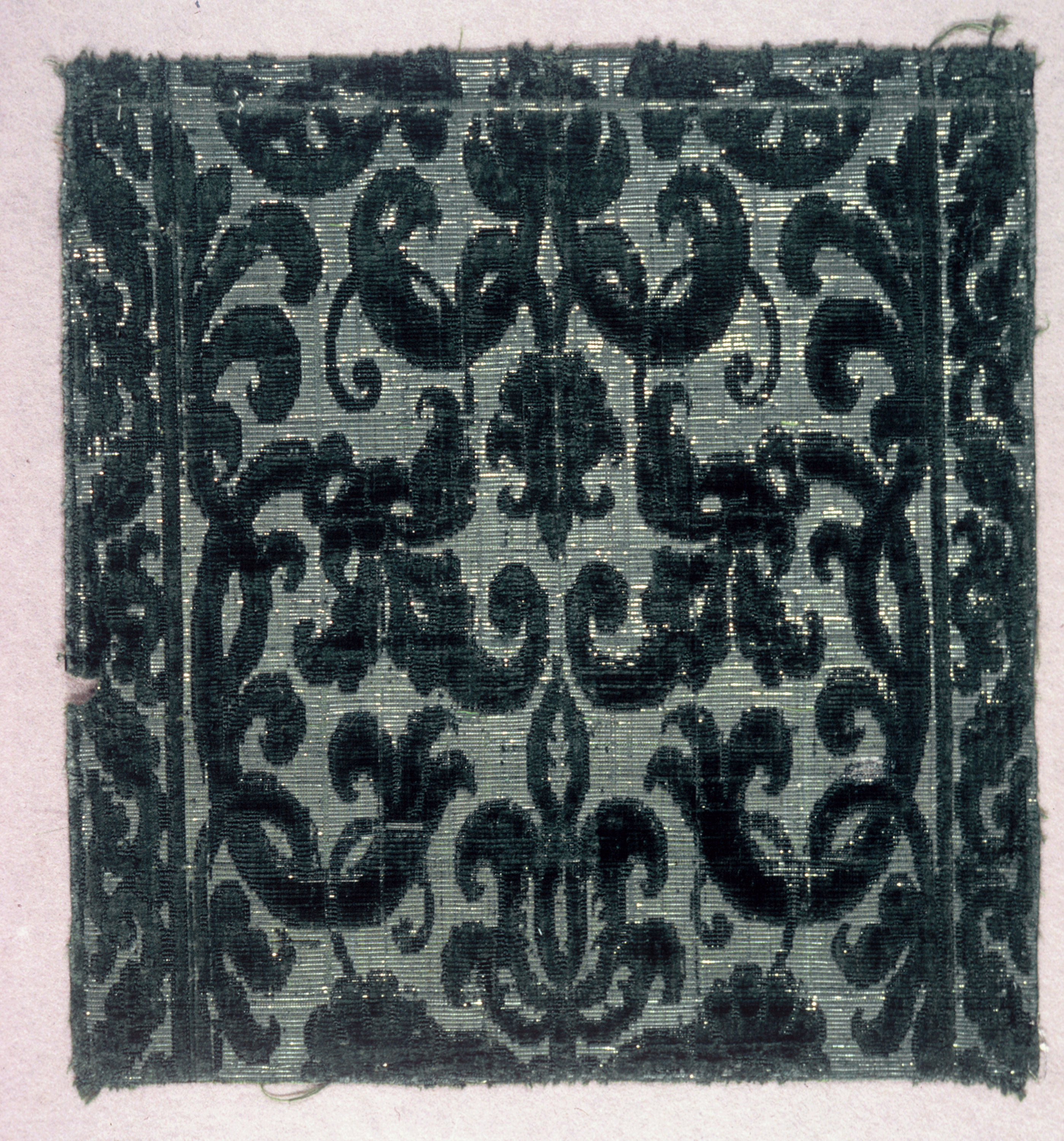 This is a Fragment. It is dated 16th–17th century and we acquired it in 1962. Its medium is silk, metallic thread and its technique is cut and uncut supplementary warp pile (velvet) in a plain weave foundation. It is a part of the Textiles department.