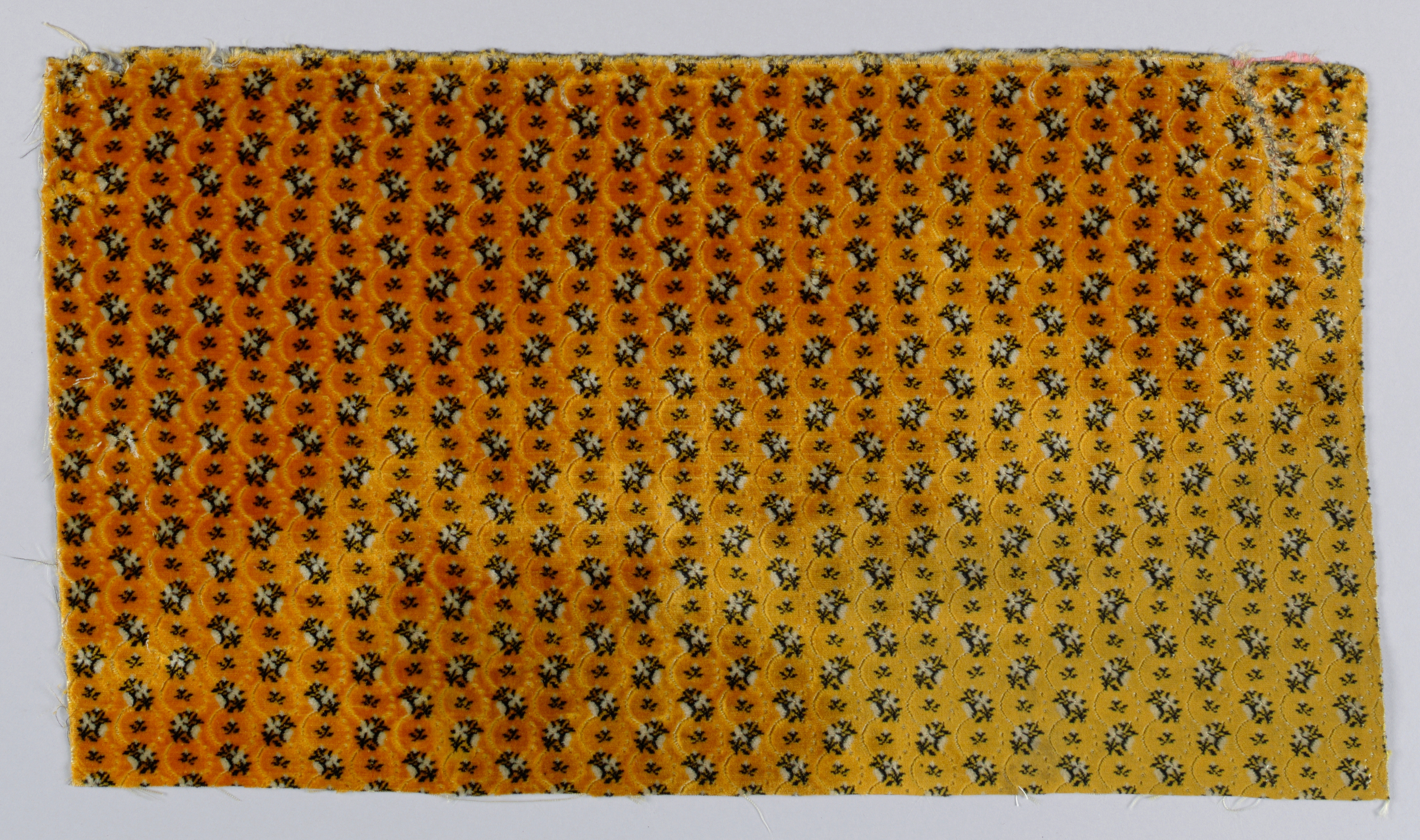 This is a Fragment. It is dated late 18th century and we acquired it in 1962. Its medium is silk and its technique is cut supplementary warp pile (velvet) in a woven foundation. It is a part of the Textiles department.