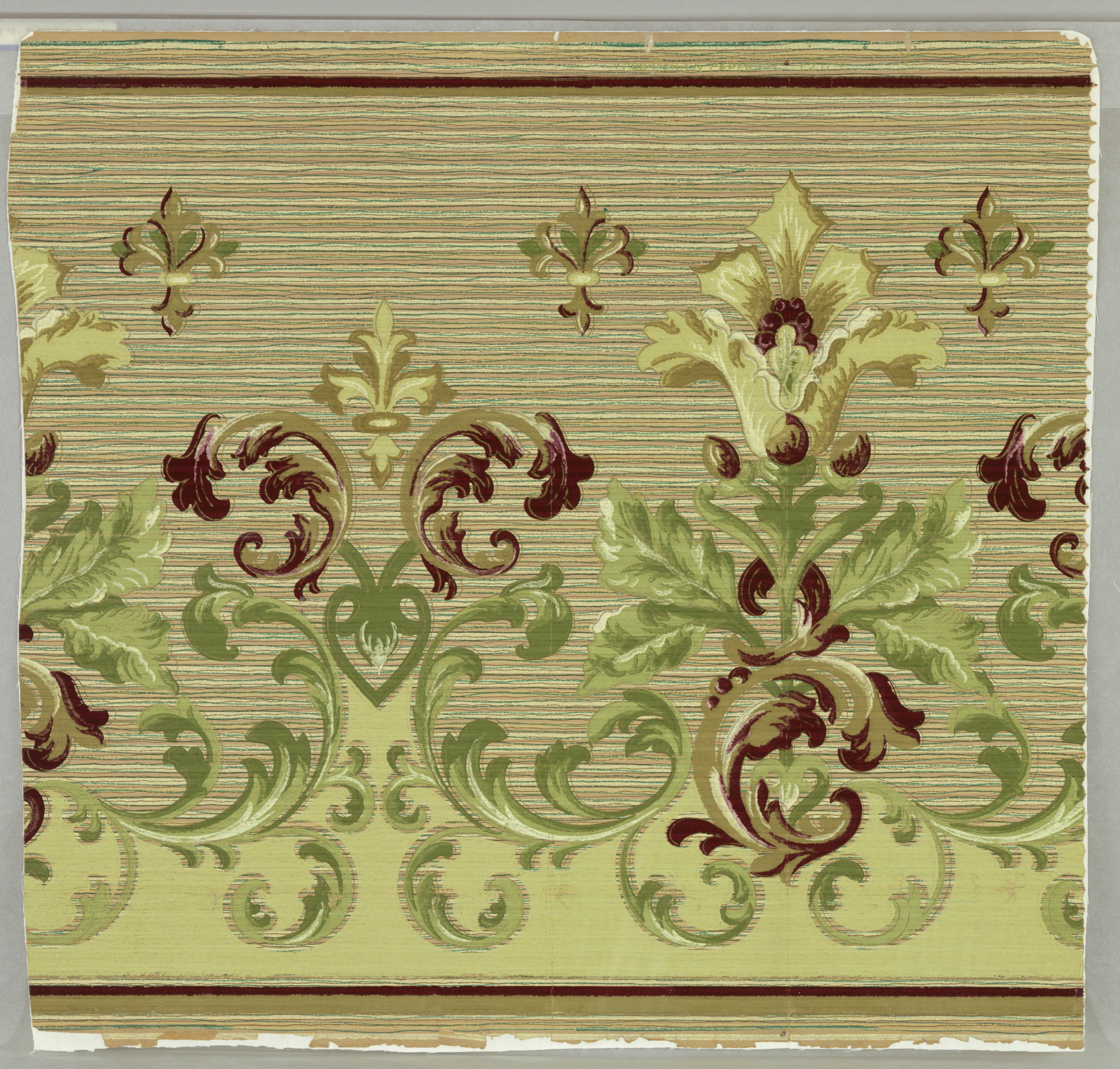 This is a frieze. It was manufactured by York Card & Paper Co.. It is dated 1900 and we acquired it in 1962. Its medium is machine-printed. It is a part of the Wallcoverings department.