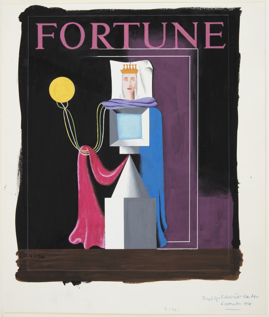 This is a Drawing. It was designed by E. McKnight Kauffer and made for (as the client) Fortune. It is dated September 1948 and we acquired it in 1963. Its medium is brush and gouache, white crayon, graphite on paper. It is a part of the Drawings, Prints, and Graphic Design department.