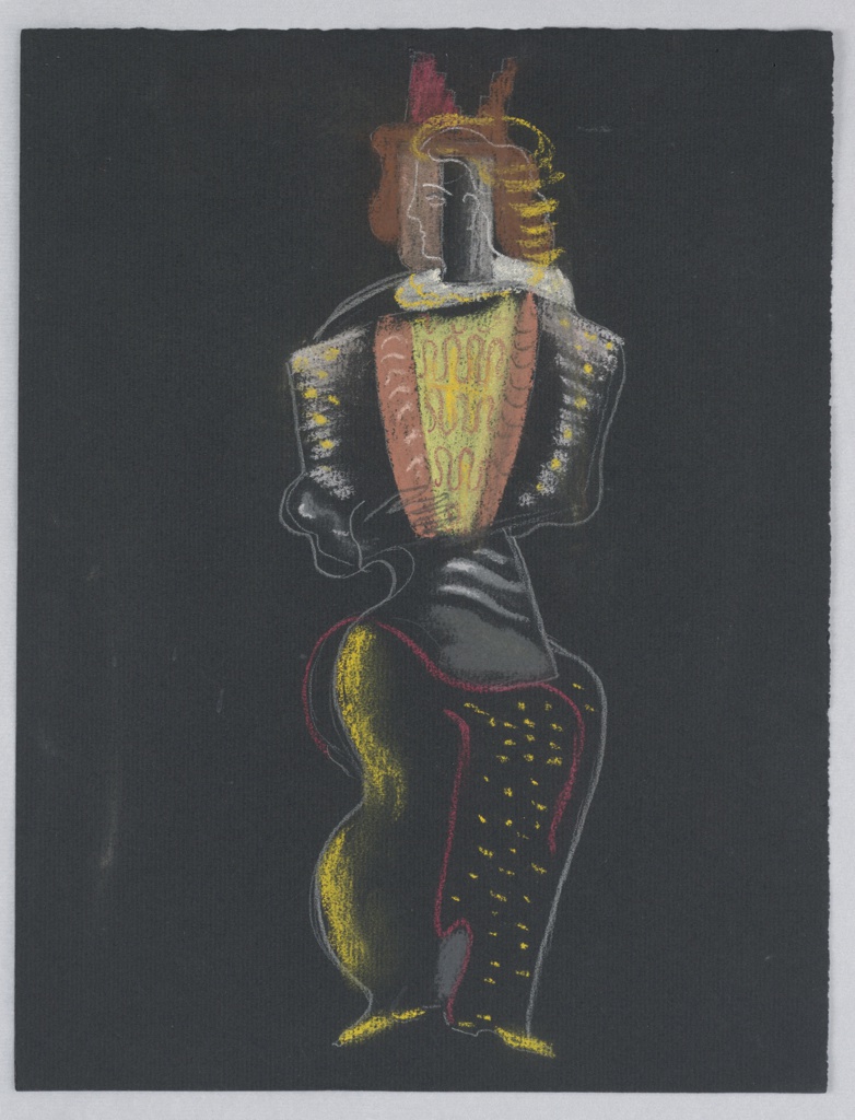 Drawing, Costume Design: Ariel (Possibly), for "The Tempest"; Designed by Edward McKnight Kauffer (American, active England, 1890–1954); Written by William Shakespeare (British, ca. 1564–1616); USA; color crayon on black paper; 31.3 × 24.1 cm (12 5/16 × 9 1/2 in.); Gift of Mrs. E. McKnight Kauffer; 1963-39-212