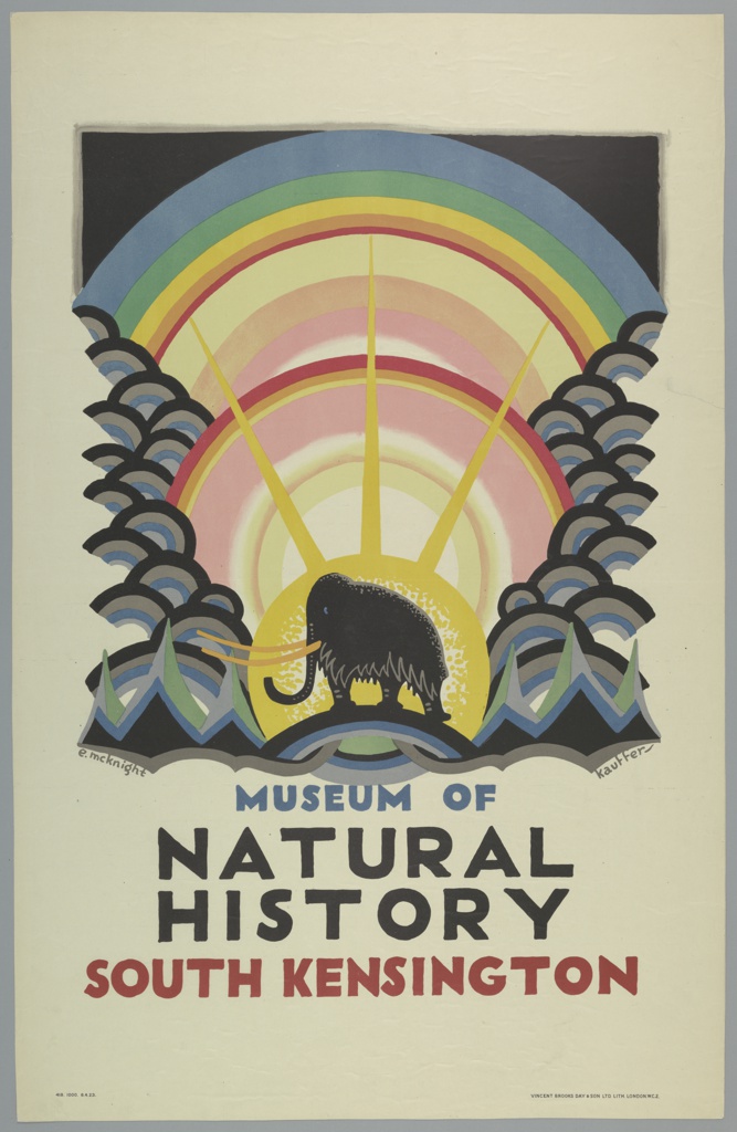 Poster, Museum of Natural History; Designed by Edward McKnight Kauffer (American, active England, 1890–1954); Printed by Vincent Brooks, Day & Son; Client: Underground Electric Railways of London Company Ltd.; USA; lithograph; 96.4 × 62.2 cm (37 15/16 × 24 1/2 in.); Gift of Mrs. E. McKnight Kauffer; 1963-39-25