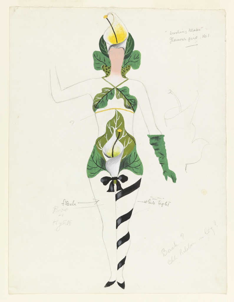 Inscribed in graphite, upper right: "Dashing Blades" / Glamour girl. No. 1.; left center: ?; arrow pointing to legs, left: flesh / Bare / & / tights; right: white tight; lower right: Back? / Blk Ribbon on leg?