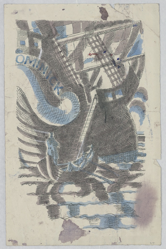 Print, Illustration for Benito Cereno; Written by Herman Melville (American, 1819–1891); Designed by Edward McKnight Kauffer (American, active England, 1890–1954); Printed by The Curwen Press (United Kingdom); Published by Nonesuch Press; USA; offset lithograph, hand-colored additions in brush and blue and purple watercolor on paper; 30.3 × 19.3 cm (11 15/16 × 7 5/8 in.); Gift of Mrs. E. McKnight Kauffer; 1963-39-296