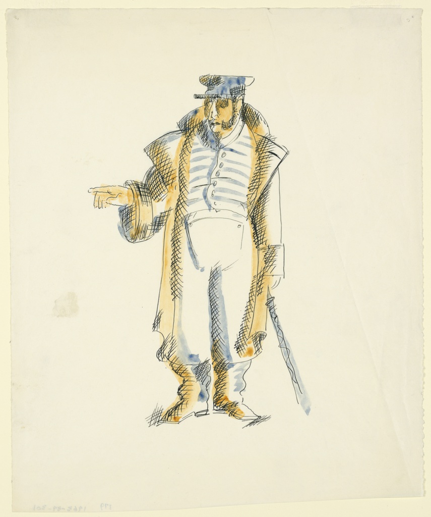 Drawing, Illustration for Benito Cereno; Designed by Edward McKnight Kauffer (American, active England, 1890–1954); Written by Herman Melville (American, 1819–1891); Published by Nonesuch Press; USA; pen and black ink, brush and blue and brown watercolor on paper; 32.2 × 26.3 cm (12 11/16 × 10 3/8 in.); Gift of Mrs. E. McKnight Kauffer; 1963-39-301