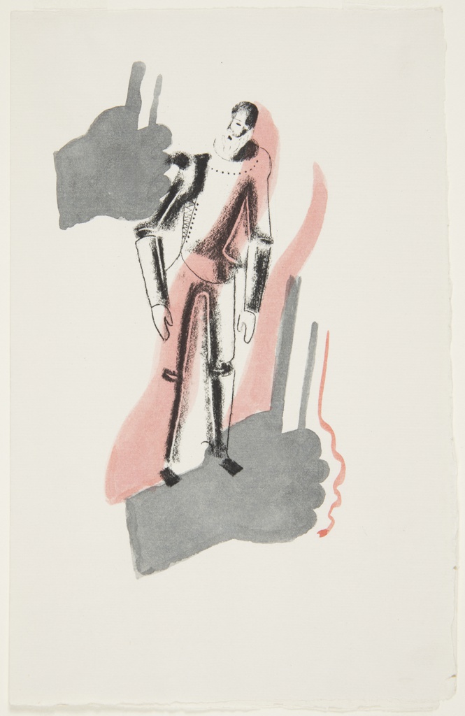 Print, Illustration for Don Quixote; Written by Miguel de Cervantes (Spanish, 1547–1616); Designed by Edward McKnight Kauffer (American, active England, 1890–1954); Printed by The Curwen Press (United Kingdom); Published by Nonesuch Press; USA; offset lithograph, hand-colored additions in brush and gray and pink watercolor on paper; 22.9 × 14.2 cm (9 × 5 9/16 in.); Gift of Mrs. E. McKnight Kauffer; 1963-39-349-b